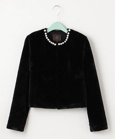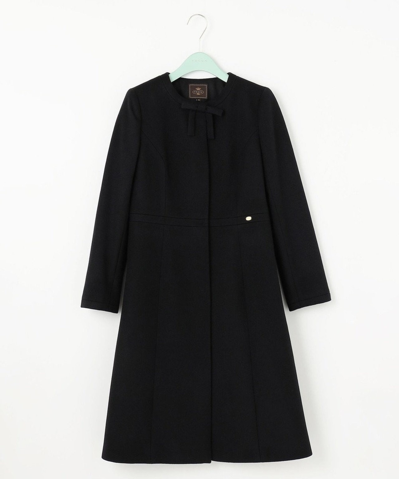襟もとにリボンがついた新作コート。大人っぽいブラックはWEB限定カラーとなっています。