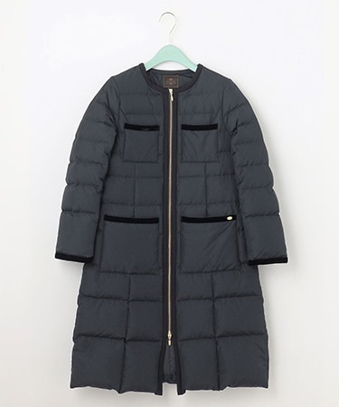 ロングジャケットのようなデザインの新作ダウン。ノーカラーなので、マフラーやティペットもお楽しみいただけます。 -