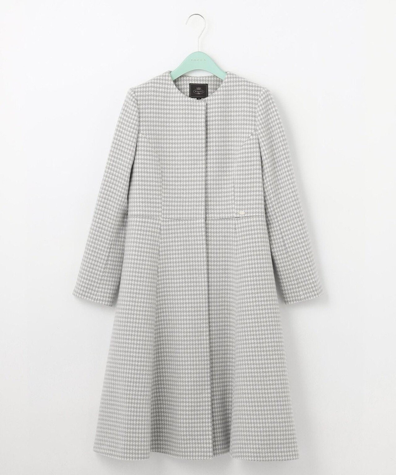 小ぶりな千鳥柄がフェミニンなコート。シンプルなデザインでシルエットのきれいさが引き立ちます。