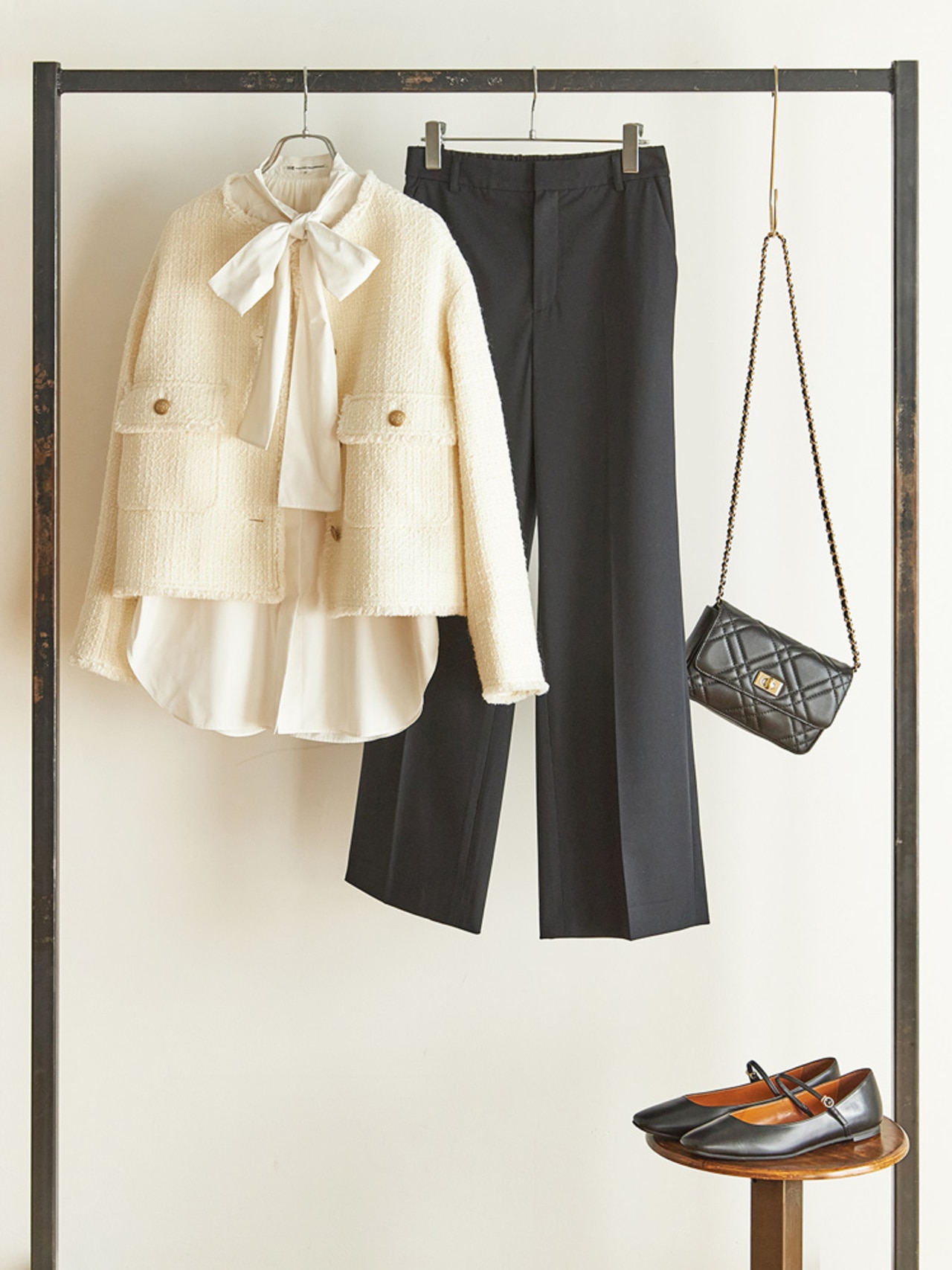 スラブ糸 *1 とシャイニーなテープ糸を使用した構造的なデザインのツイード。 ベースと同じ色でチェック柄のデザインを作っているため、エレガントな中にもカジュアルさのある仕上がりが特徴です。