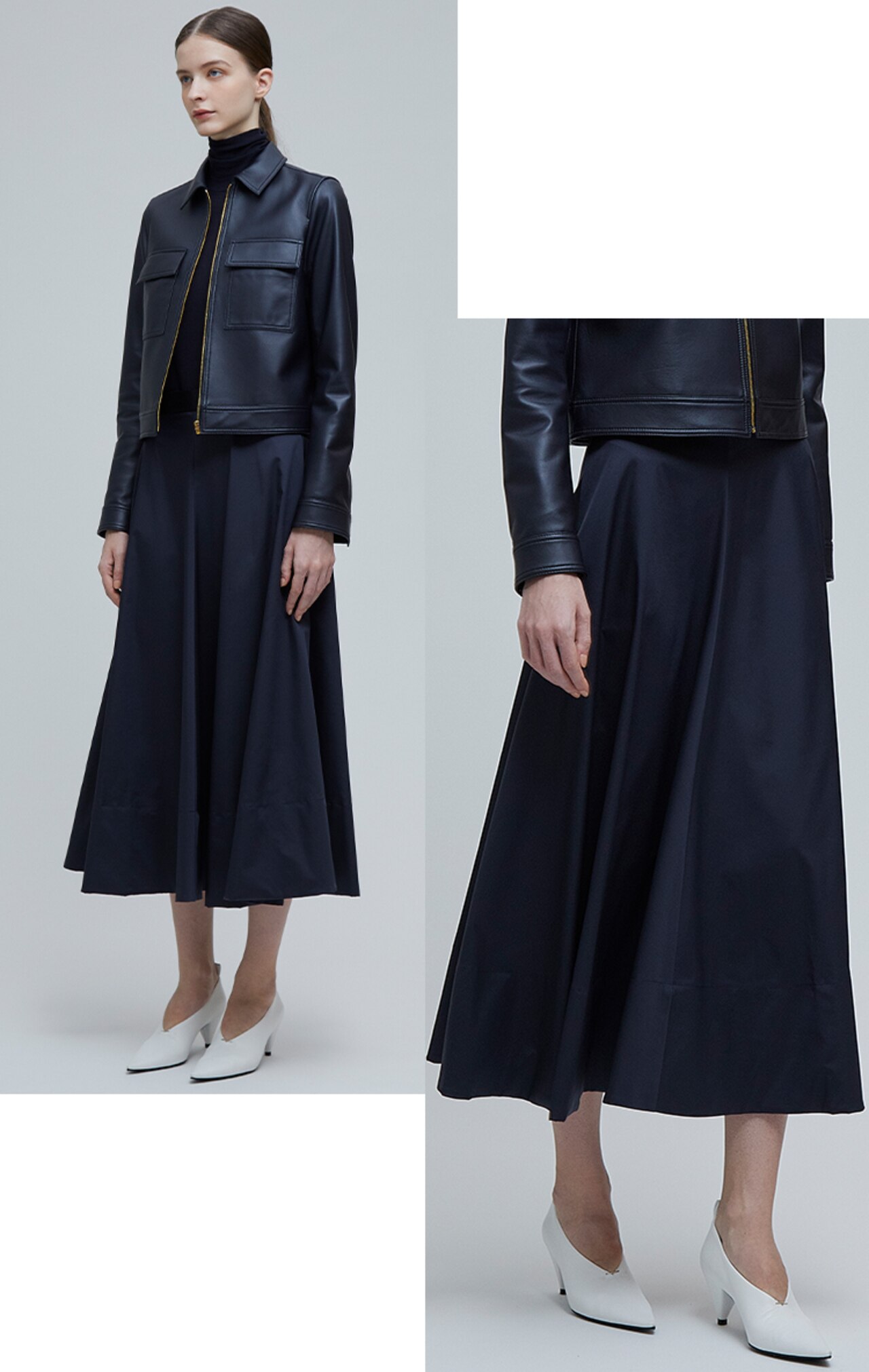 裾に向かってたっぷりとボリュームを出したフレアスカート。ウエスト周りはボリュームを抑えることで広がりがありつつすっきりとした印象に。ハードなレザージャケットに合わせ、抜け感のある大人のフェミニンコーデが完成です。