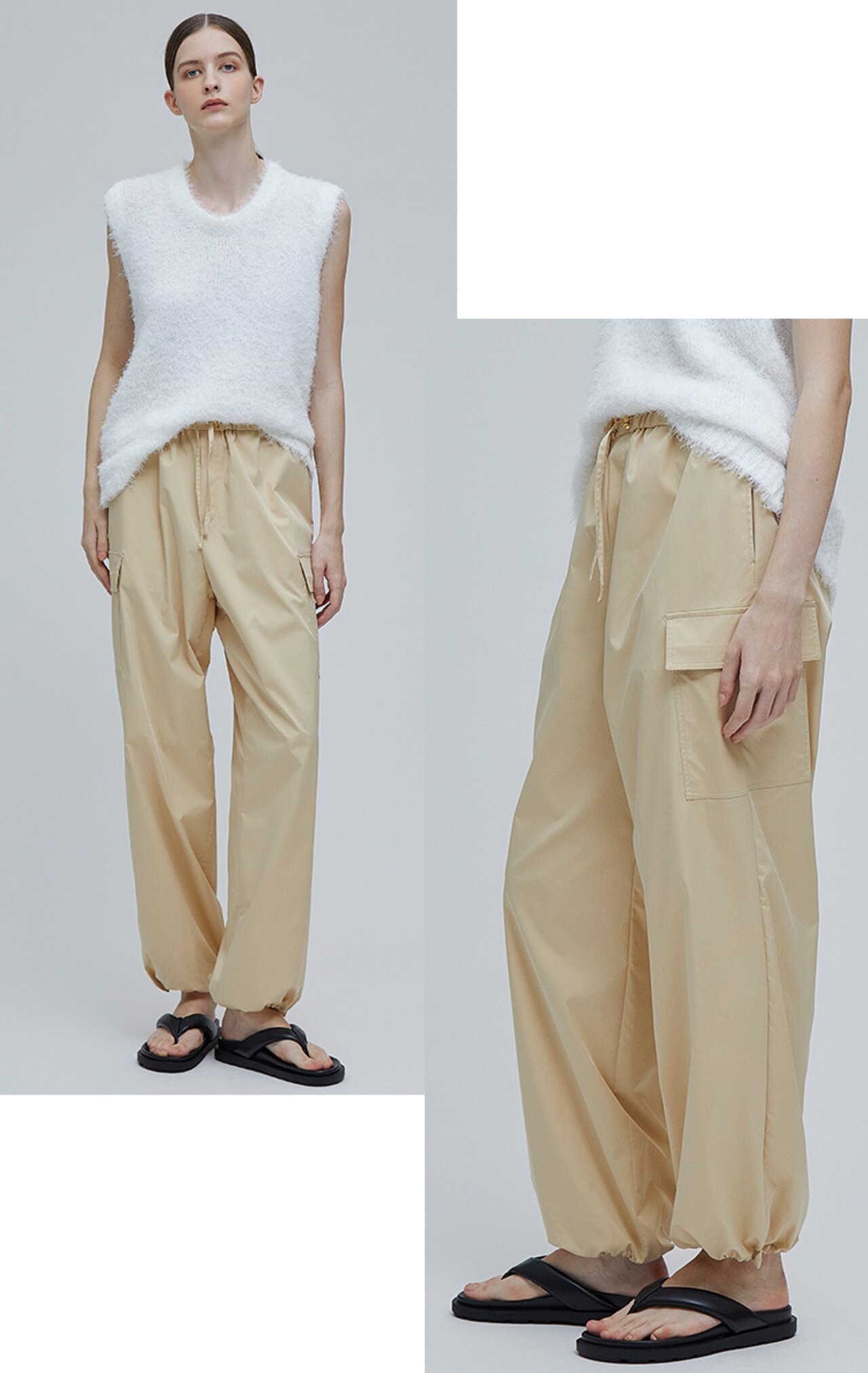 カジュアルな要素を持ちつつ、大人の雰囲気で着こなせるカーゴパンツ。裾はストッパーで太さを調節でき、スタイリングに合わせてシルエットをアレンジ頂けます。ファーニットに合わせれば、女性的かつ程よいスポーティーさを感じる大人のカジュアルコーデに。