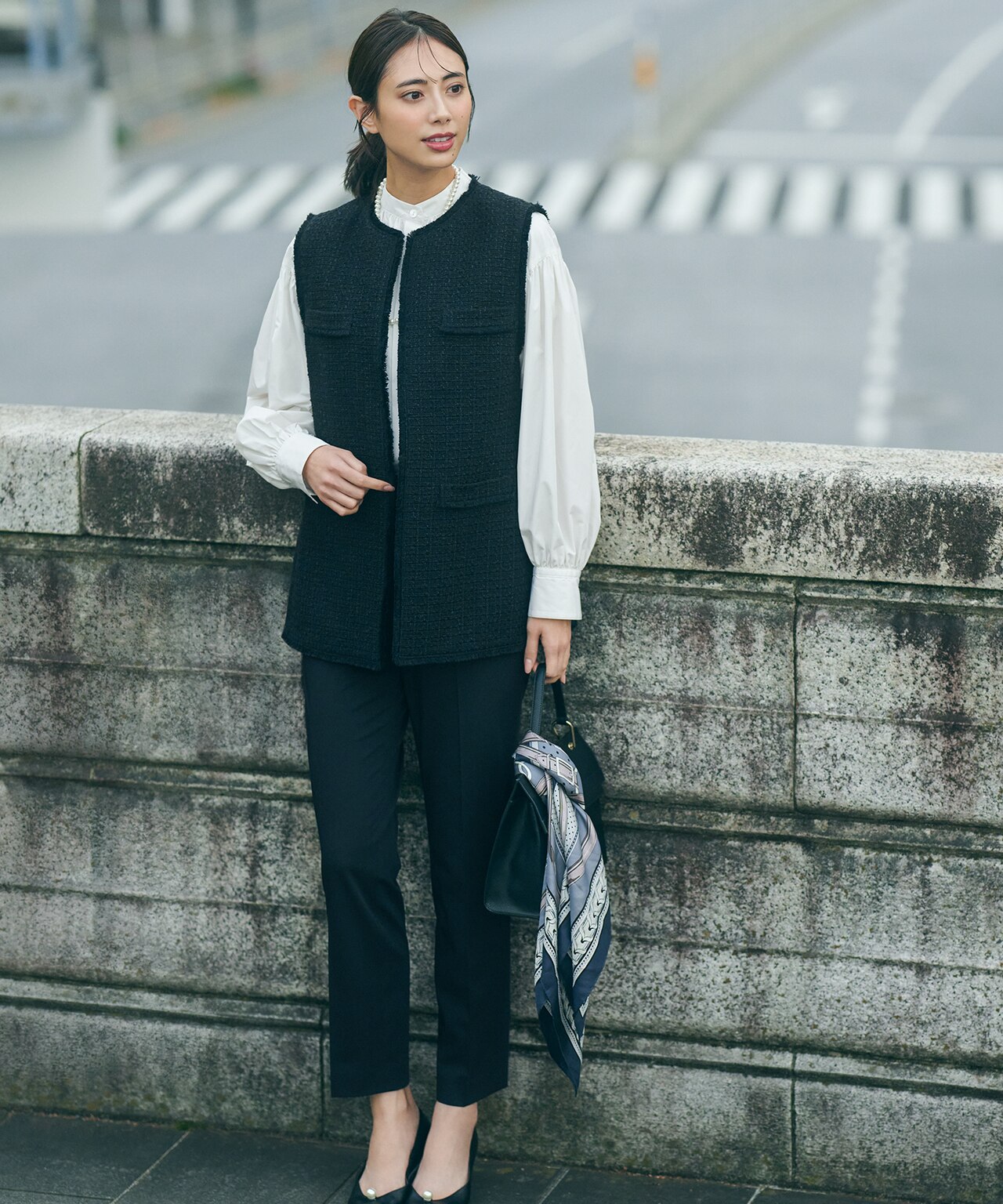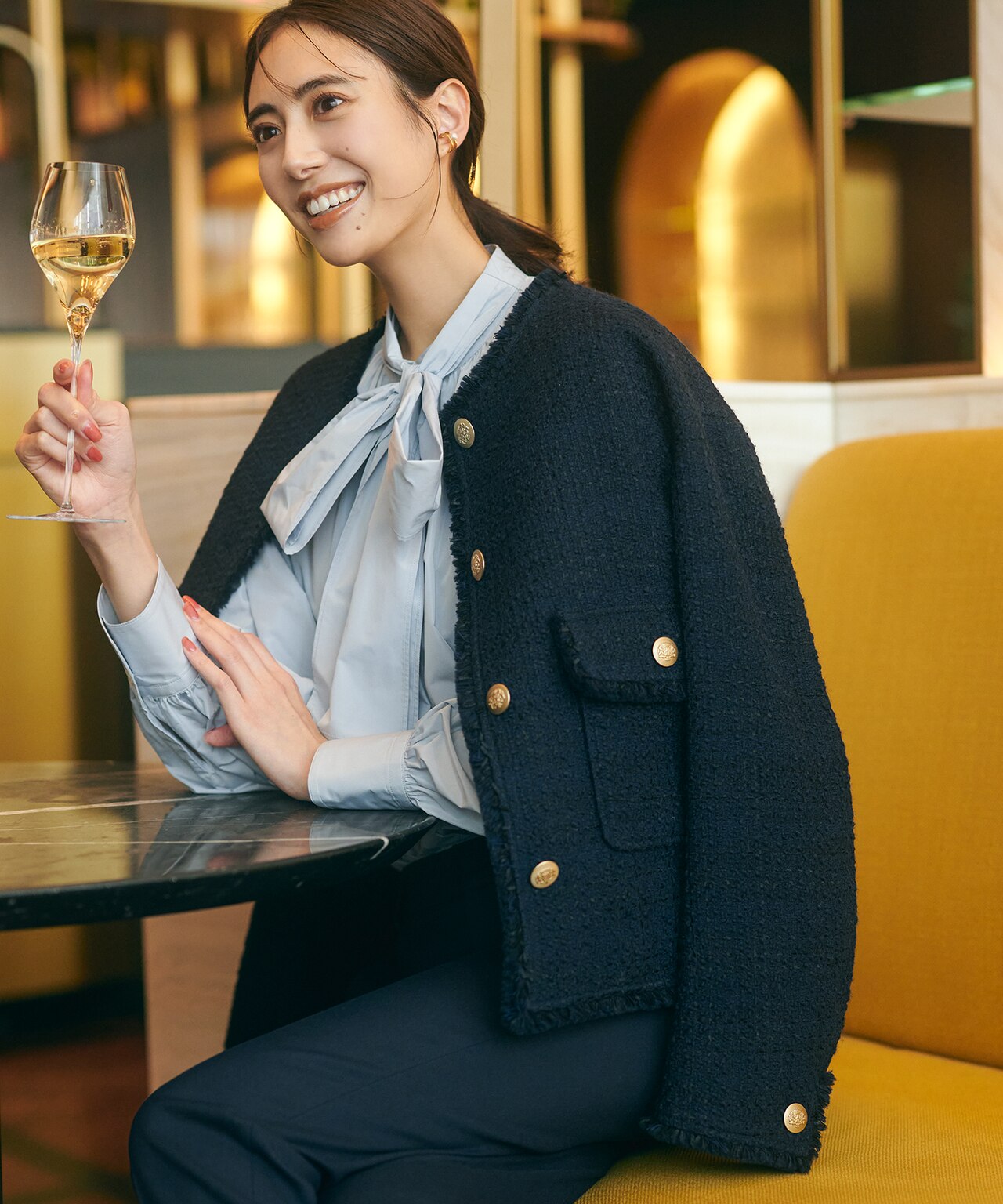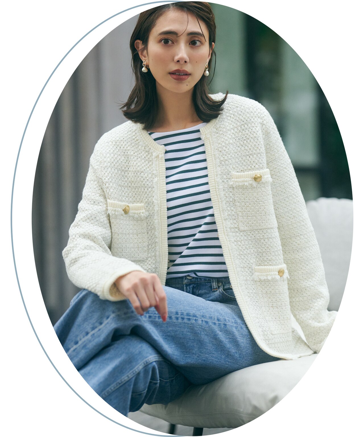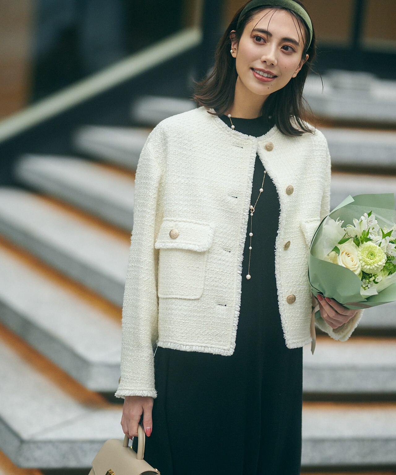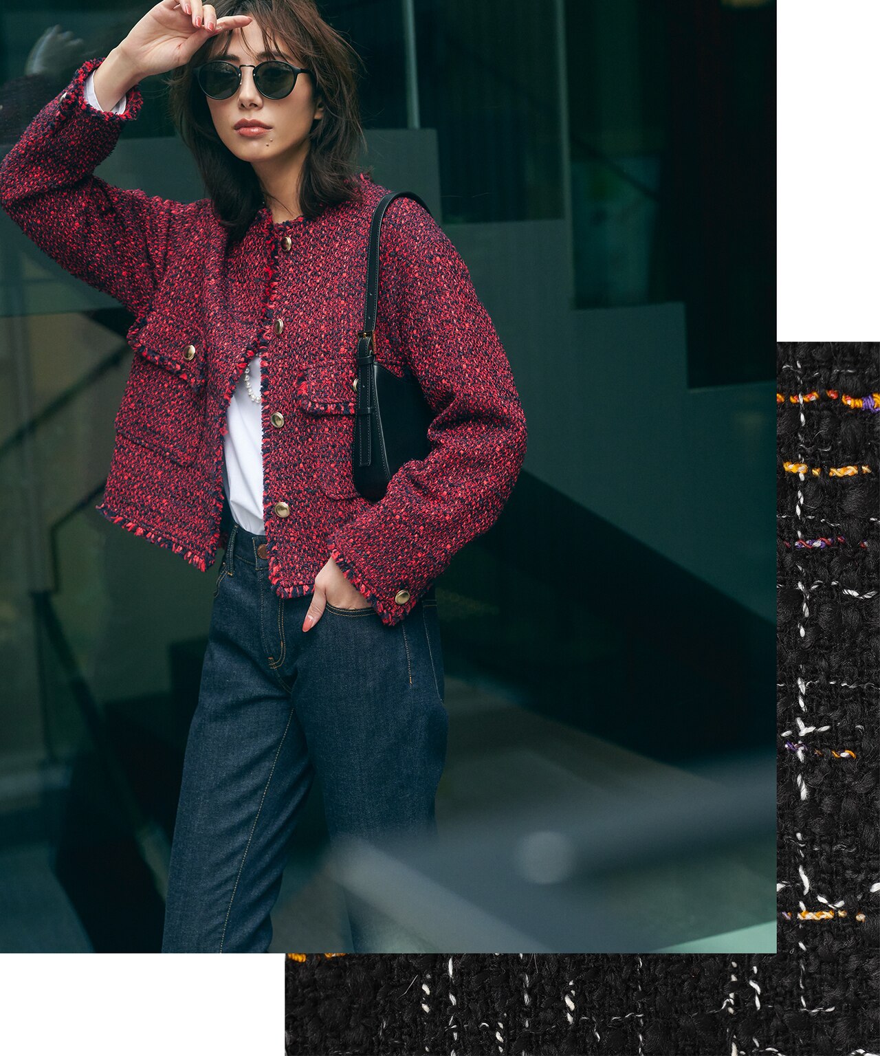 纏うだけで高揚感が高まるツイードアイテムは、組み合わせ次第できれいめにもカジュアルにも着こなせます。