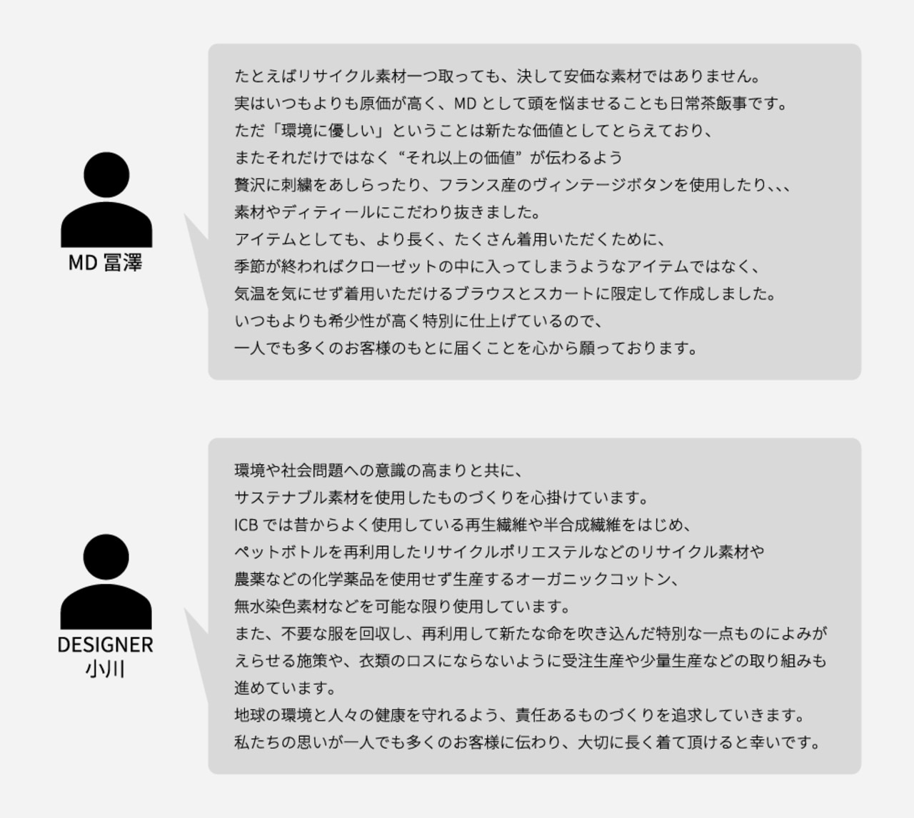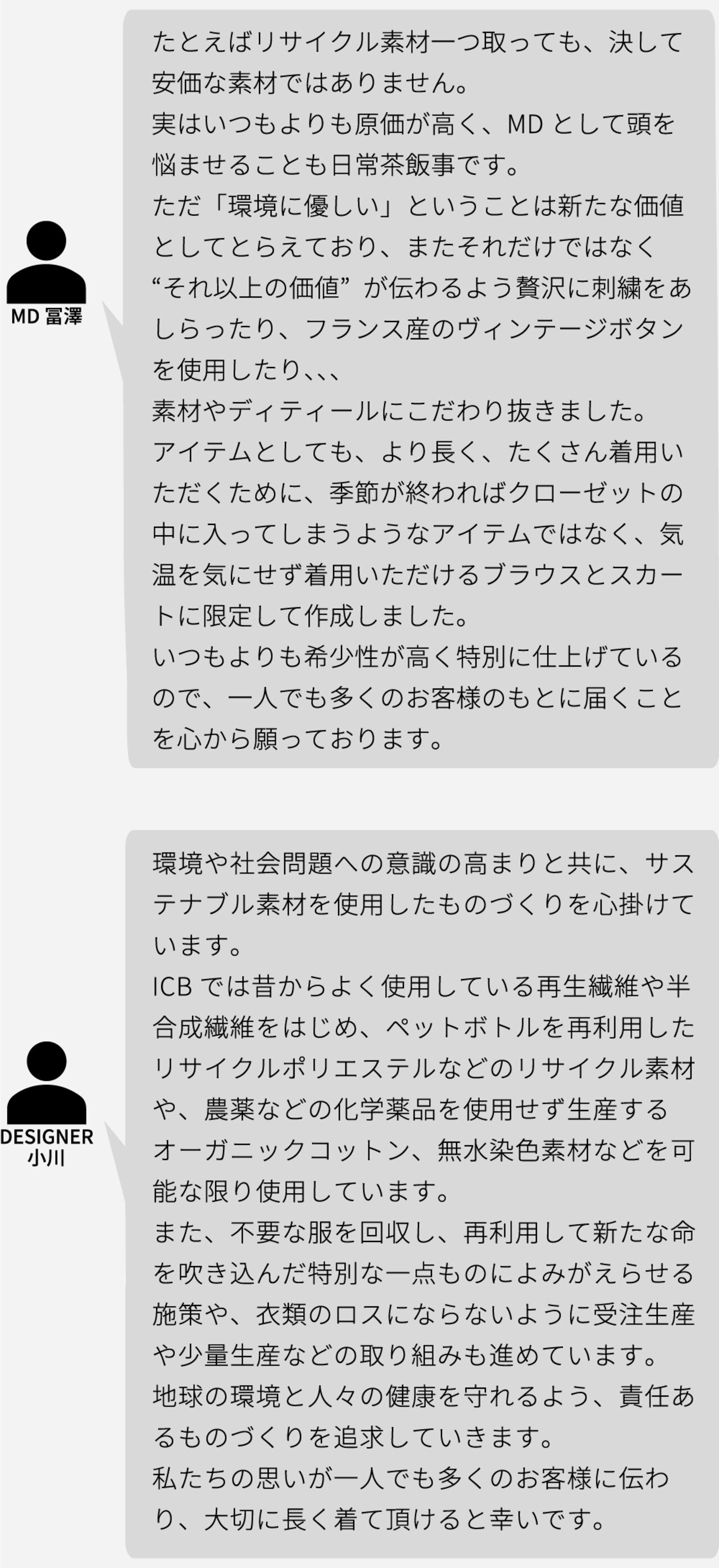最後に、ICBのモノづくりを担うMD・デザイナーのお2人に、今回ご紹介した商品やSDGsへの意識について語っていただきました。