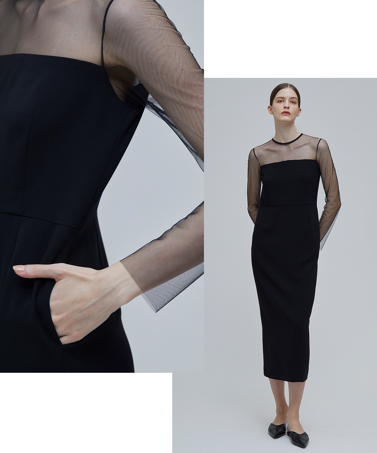 トレンドのシアー素材もブラックドレスなら取り入れやすいビスチェタイプのIラインドレス。繊細な肌の透け感がワンランク上の装いに仕上げます。