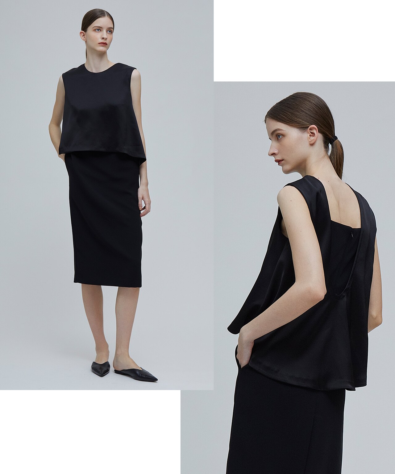 美しい光沢とマットな素材が織りなすレイヤードドレス。フロントはフレアなトップとシンプルなスカートのバランスがエレガント。バックスタイルは大きく開いた大人のシルエットで1枚で華やぐデザインです。
