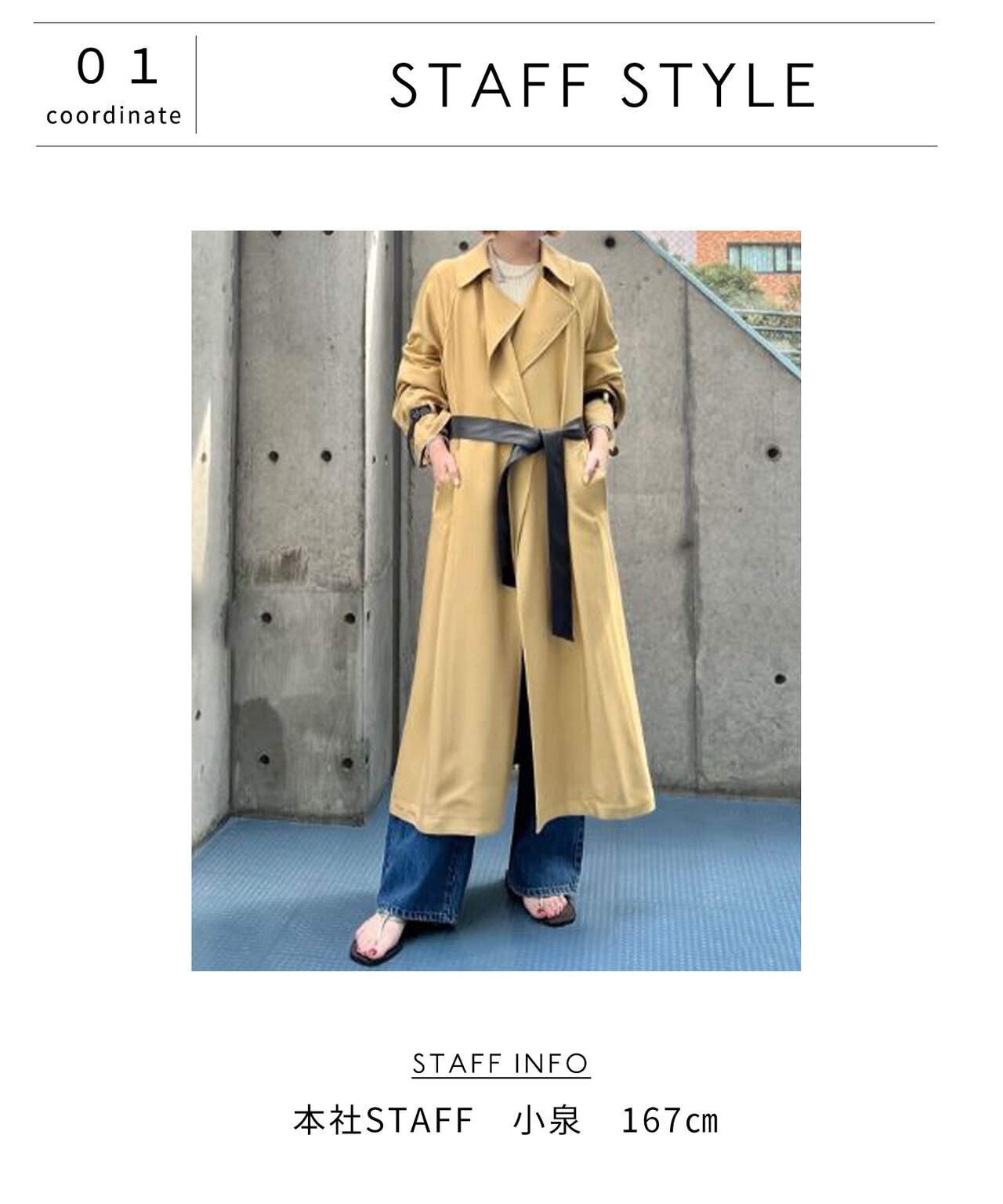 ゆったとしたサイズ感がインナーを選ばず、ジャケットやざっくりニットにも合わせられるのが嬉しいポイント。キレイ目なワンピースやパンツスタイルに合わせるのはもちろん、デニムやカーゴパンツと合わせて大人のカジュアルコーデも楽しめるルーズシルエットのトレンチコートです。