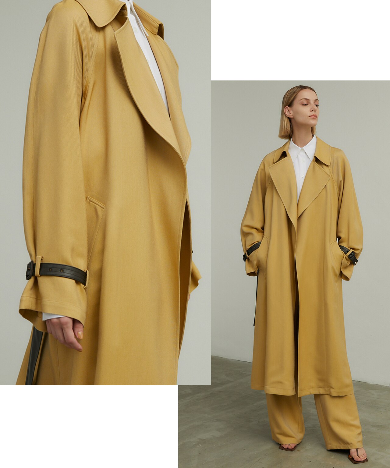 しっかりとした肉感がありつつも、さらっとした生地感で重く見え過ぎないのが嬉しいポイント。ゆったりとしたサイズ感で、肉厚なニットやジャケットなどの上からも楽に羽織れ、袖口はベルトを調節するとパフスリーブのようにフワッとするので、違った雰囲気でも楽しめます。