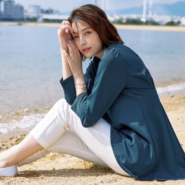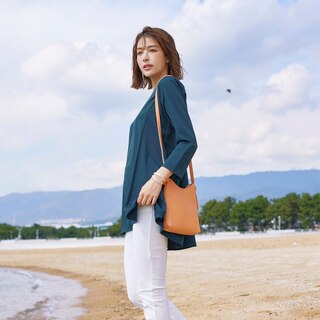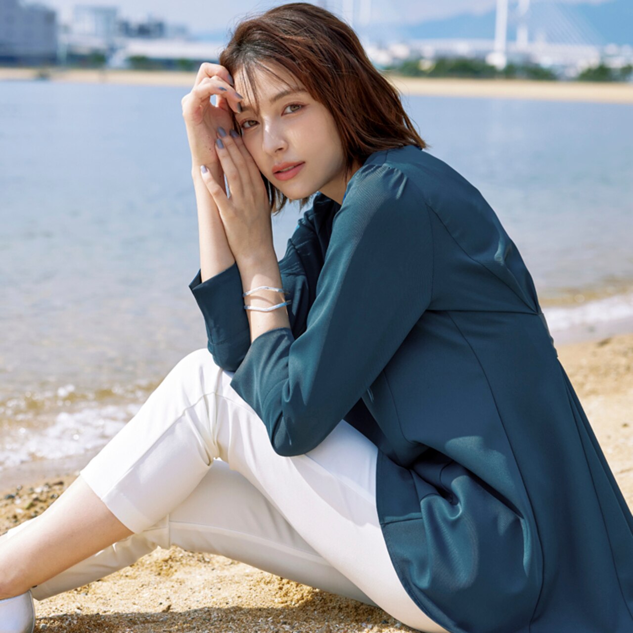 2024年の新色2つ目は映えカラーのターコイズ。一見、難しそうなカラーに見えますが、実はターコイズも着回し力抜群。ホワイトのパンツやブラックはもちろん、インディゴのデニムでトーンをあわせてカジュアルに着こなしたり、淡いデニムを使って爽やかな印象を演出したりなど、合わせるパンツを変えるだけでいろいろな見え感を楽しめます。ベージュのパンツもおすすめです!