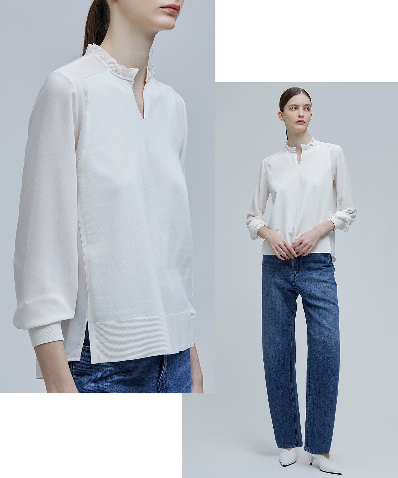 ストレッチ入りの素材が心地良く、前身頃と袖リブのみをニットにすることでブラウスのような軽やかなデザイン。タイトスカートや落ち感のあるワイドパンツと合わせた女性らしいコーデや、カジュアルなデニムと合わせた大人フェミニンな着こなしがおすすめ。