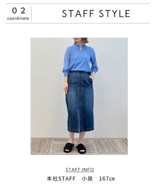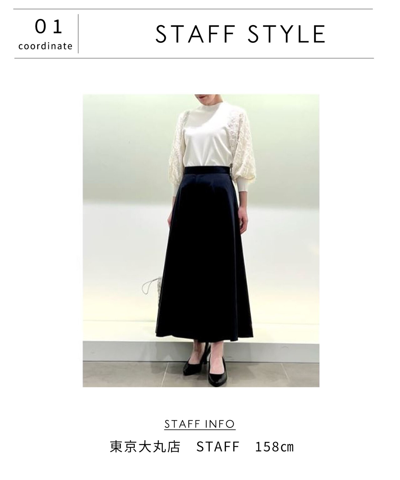 フレアスカートと合わせて、キレイ目コーディネートにしました。パンツと合わせたカジュアルなスタイリングもお薦めで、普段使いからオフィス、お出かけなどシーンを選ばずに着回しができるニットです。