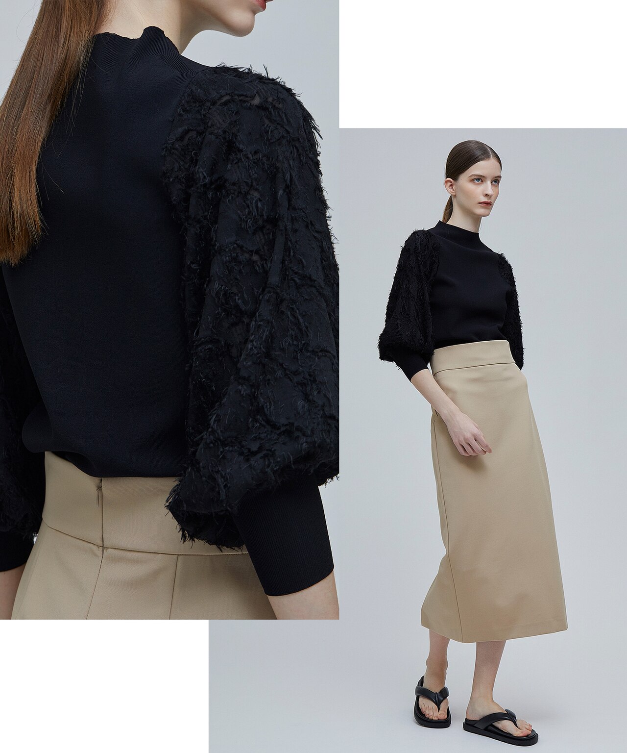 身頃はシャープに、袖にはたっぷりとタックを入れたドラマティックなニット。タイトなスカートやマニッシュなワイドパンツと合わせ、メリハリのあるスタイリングがおすすめです。