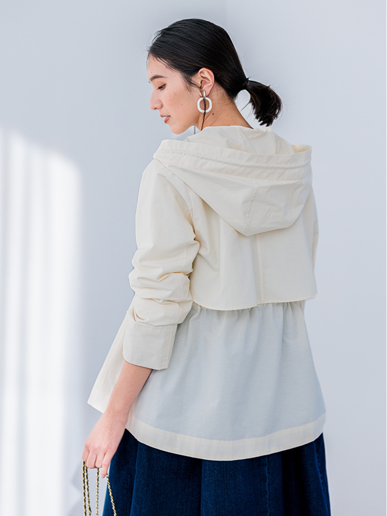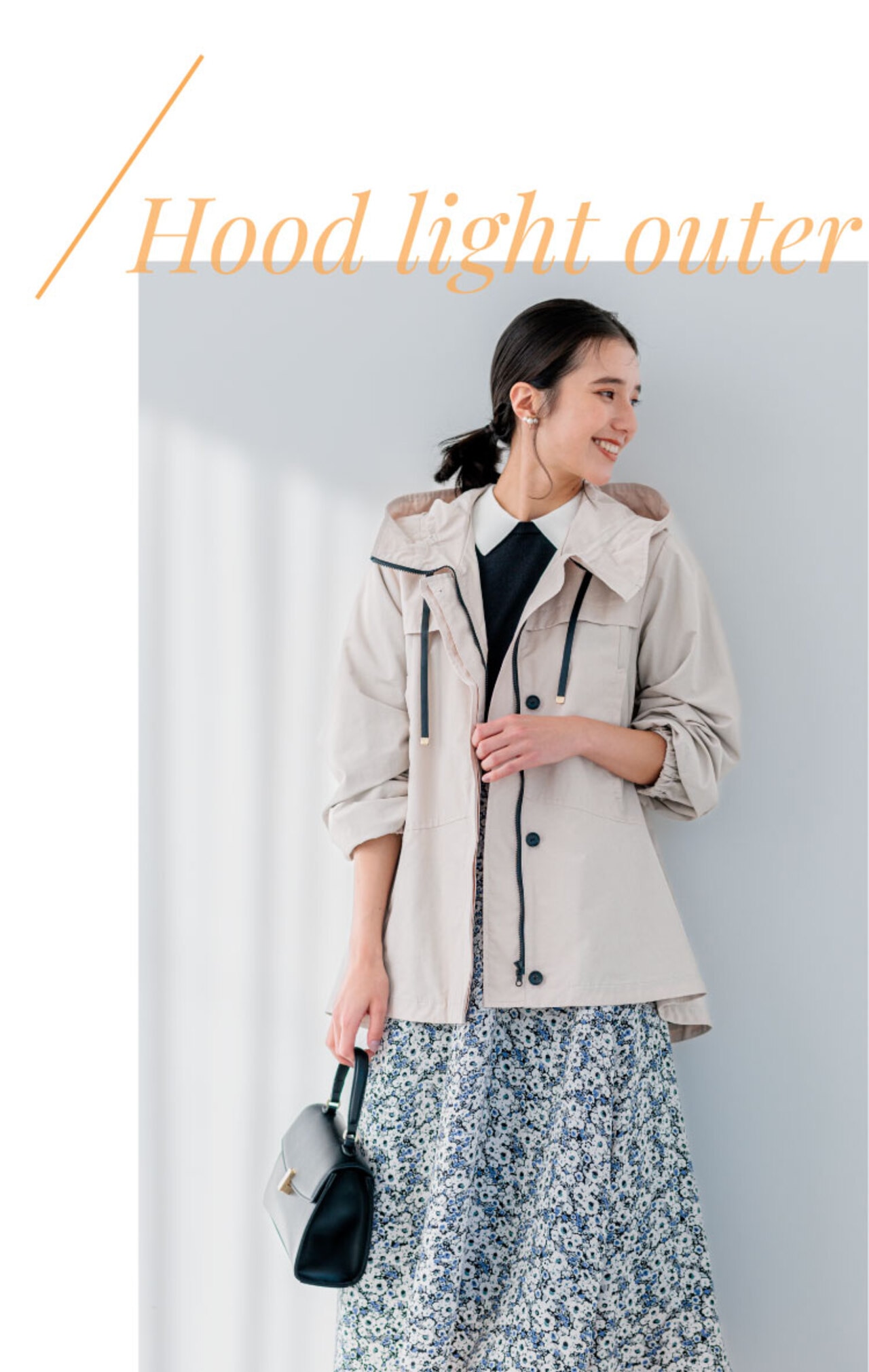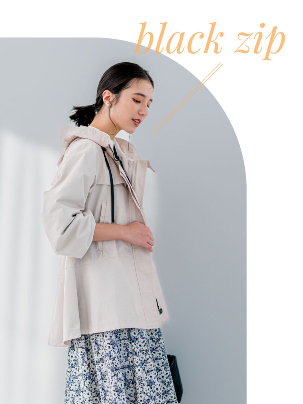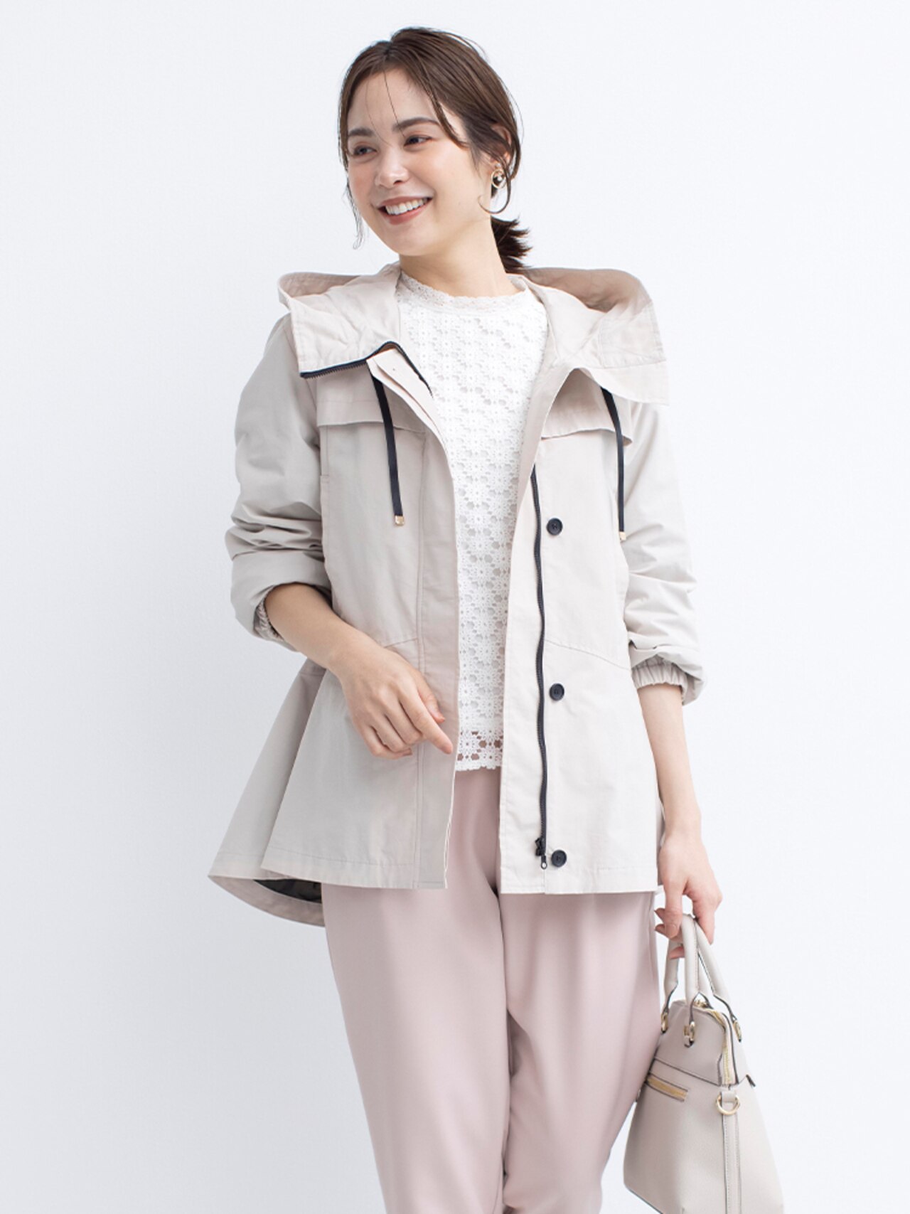 きれいめフォルムがサマ見えするフード付きブルゾン。フードは立体的になるパターンで顔周りを華やかですっきりとみせます。フードは取り外し可能なのでノーカラージャケットとしてきれいめスタイルにも!弱撥水加工が施されているのもポイントです◎