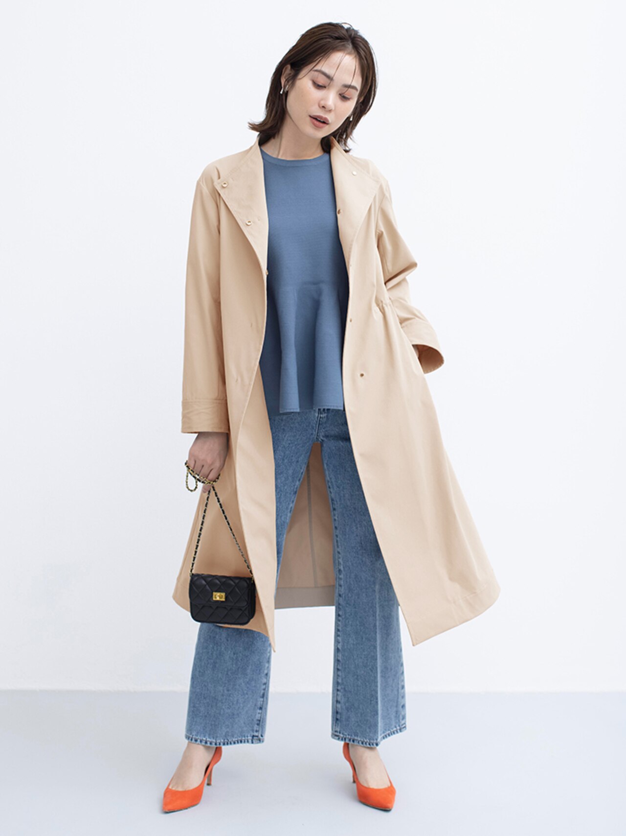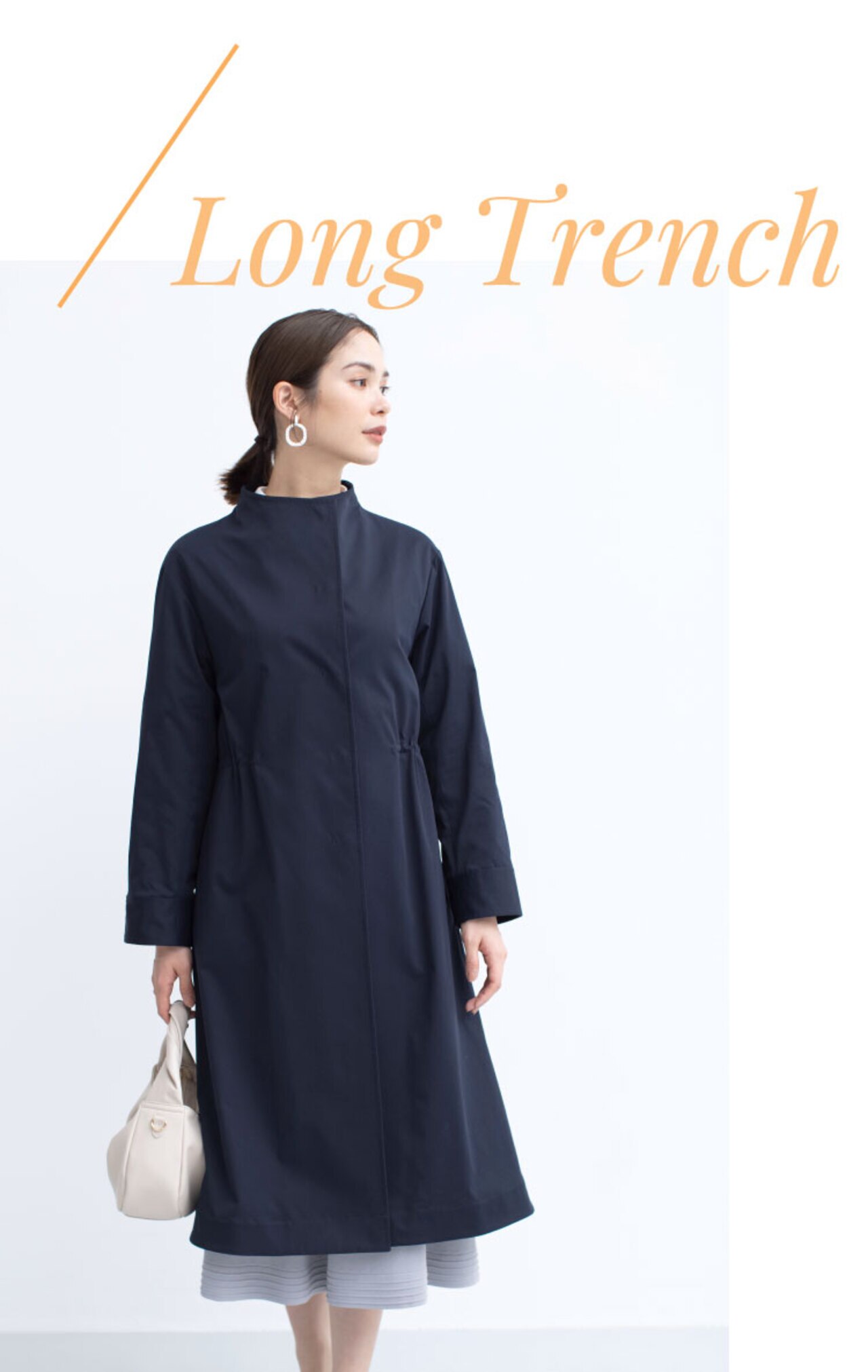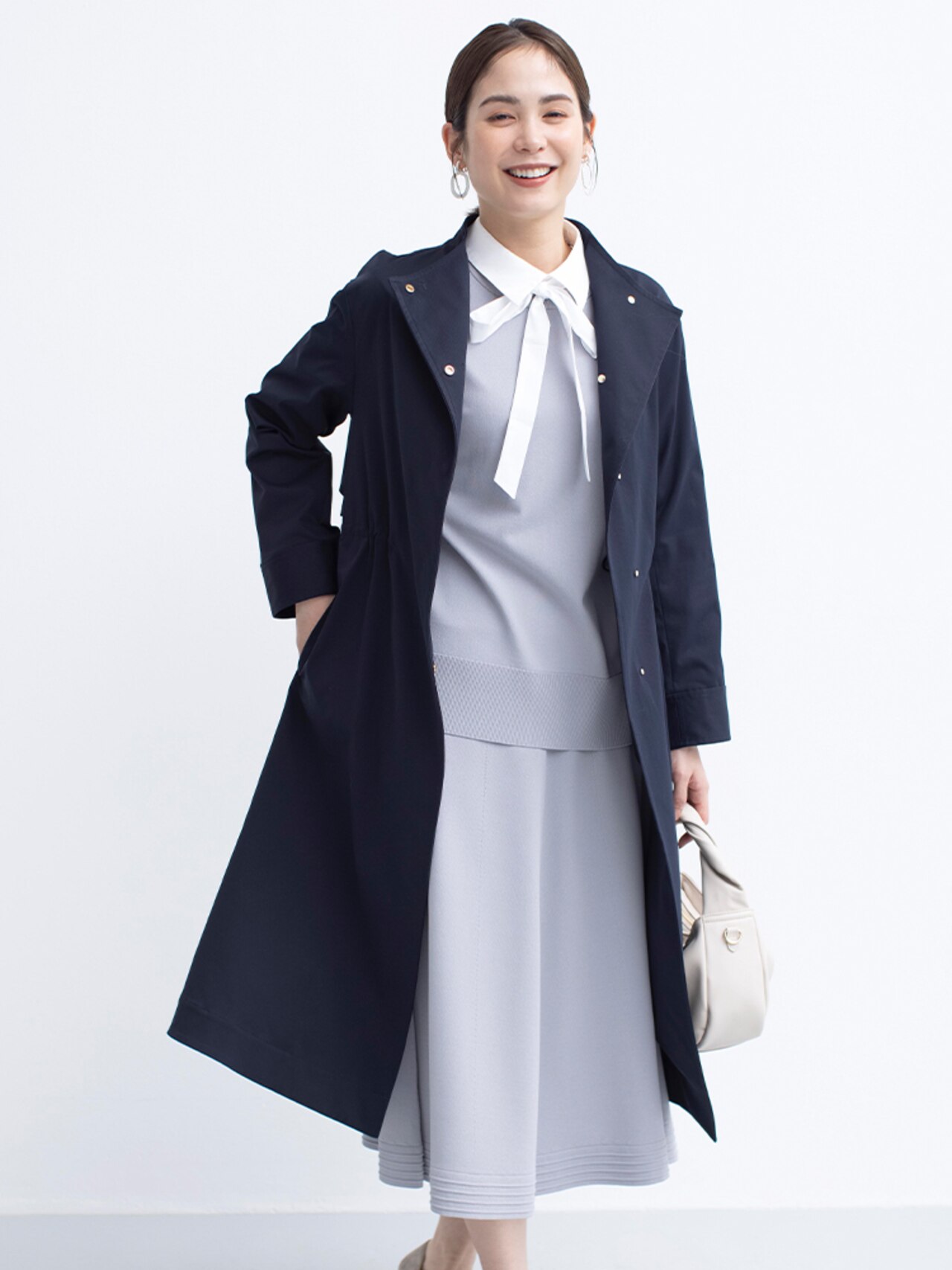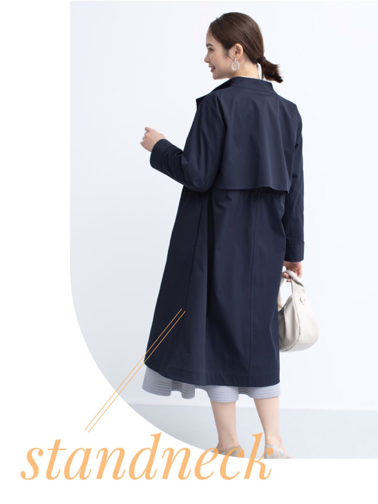 お仕事シーンでも映えるきれいめアウター。スタンドネックは前を開けると首元をすっきりと華やかにみせてくれます。ひざ下丈で程よく身体のラインから離れたAラインシルエットがポイントです!