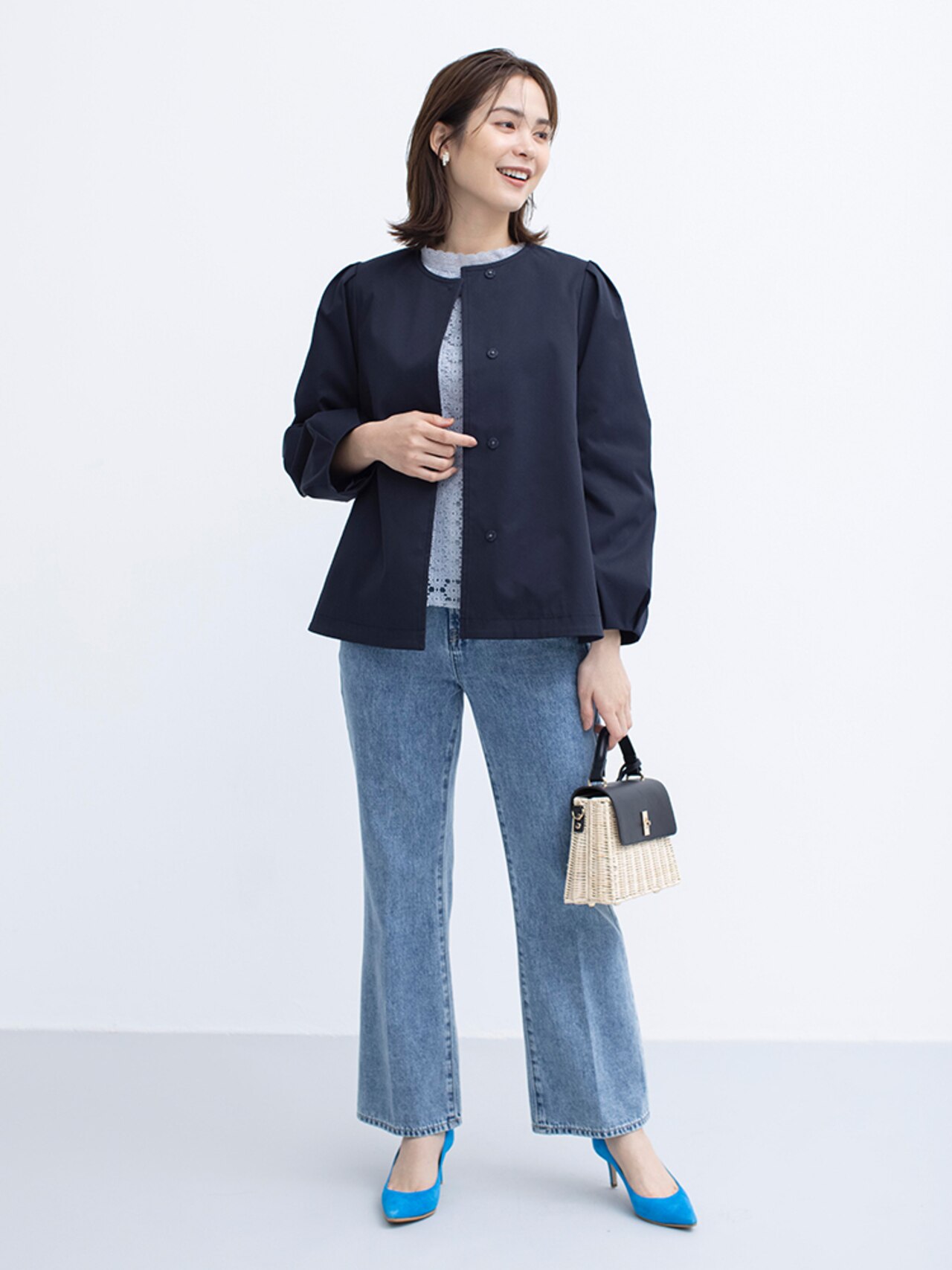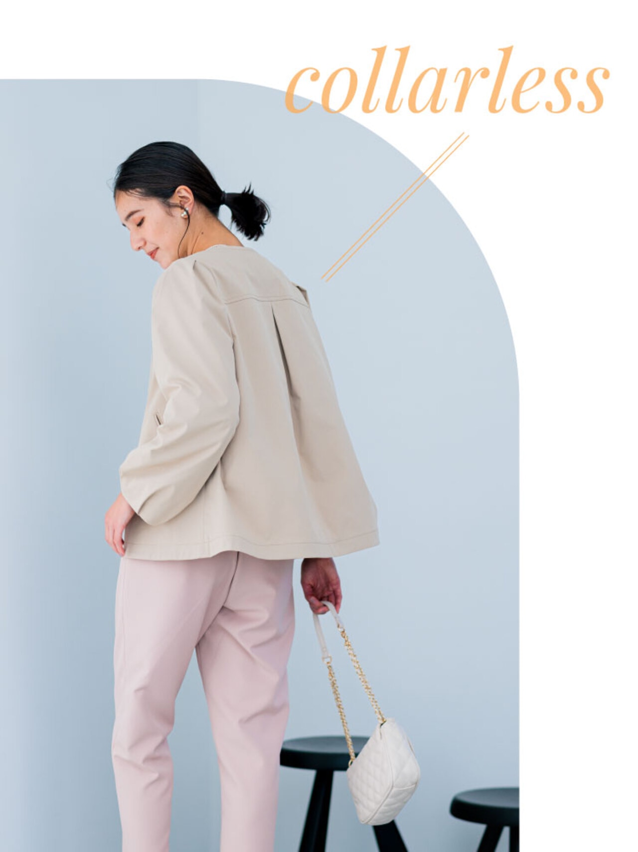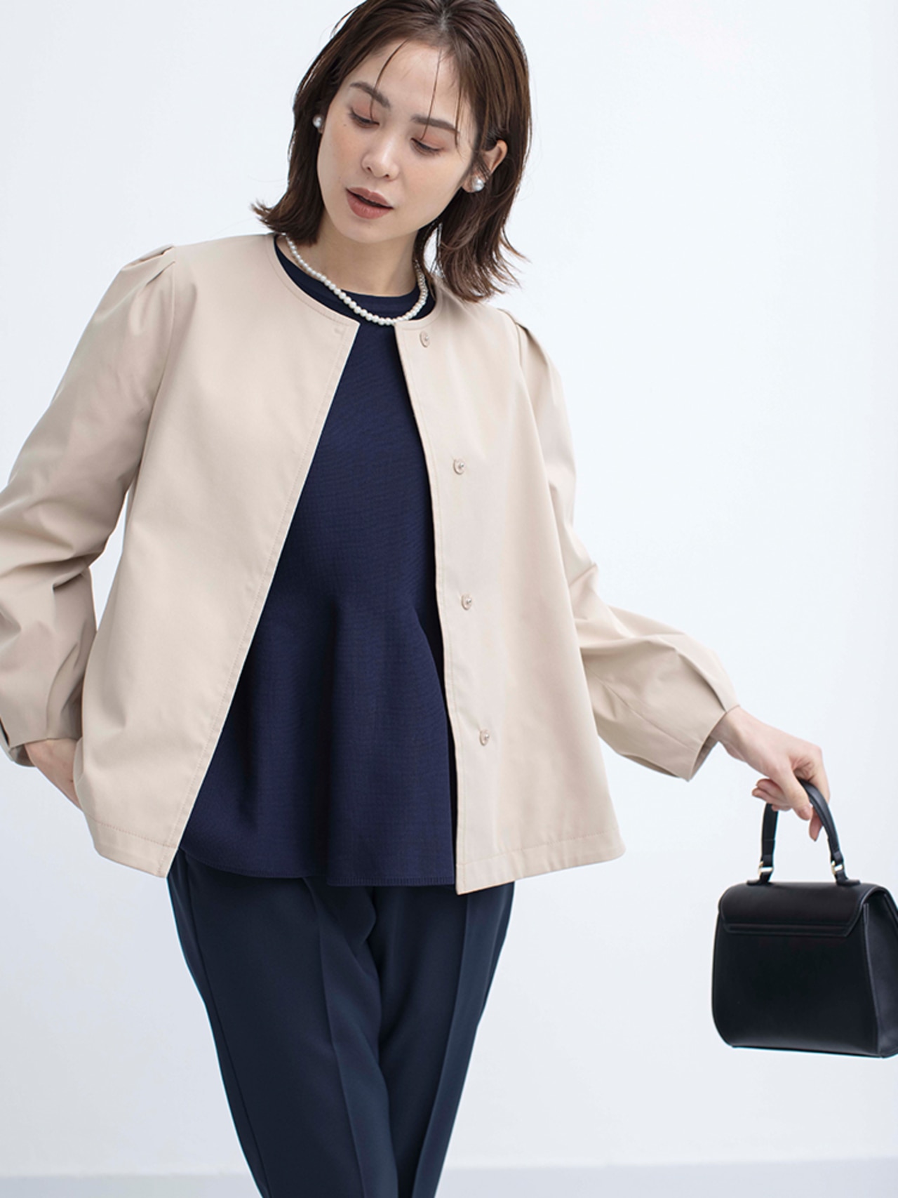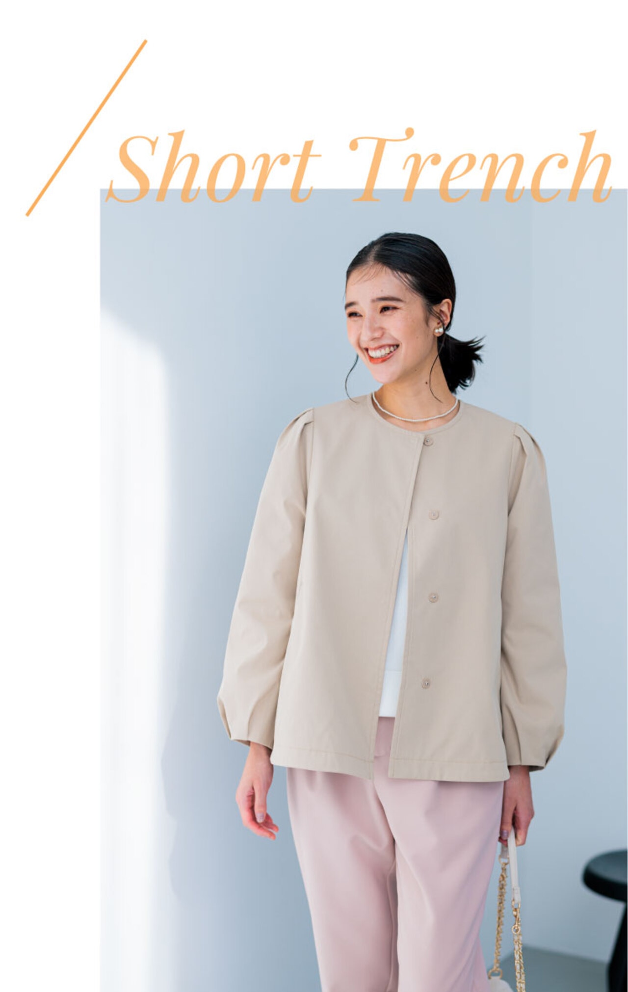 様々なボトムと好相性のノーカラーショートコート。顔周りを華やかに魅せる立体感な袖がデザインポイントです。前後差をつけた裾がお尻にかかる着丈感となっているのコンパクトながら安心感も!