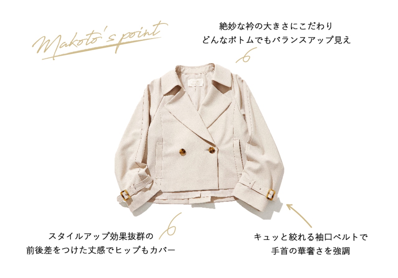 低身長さんでも好バランスに仕上がるショート丈のトレンチコート。