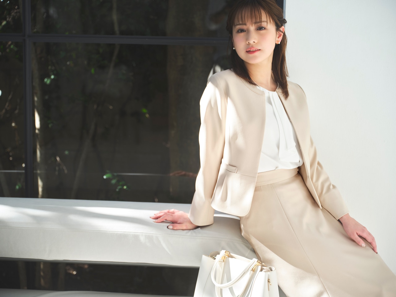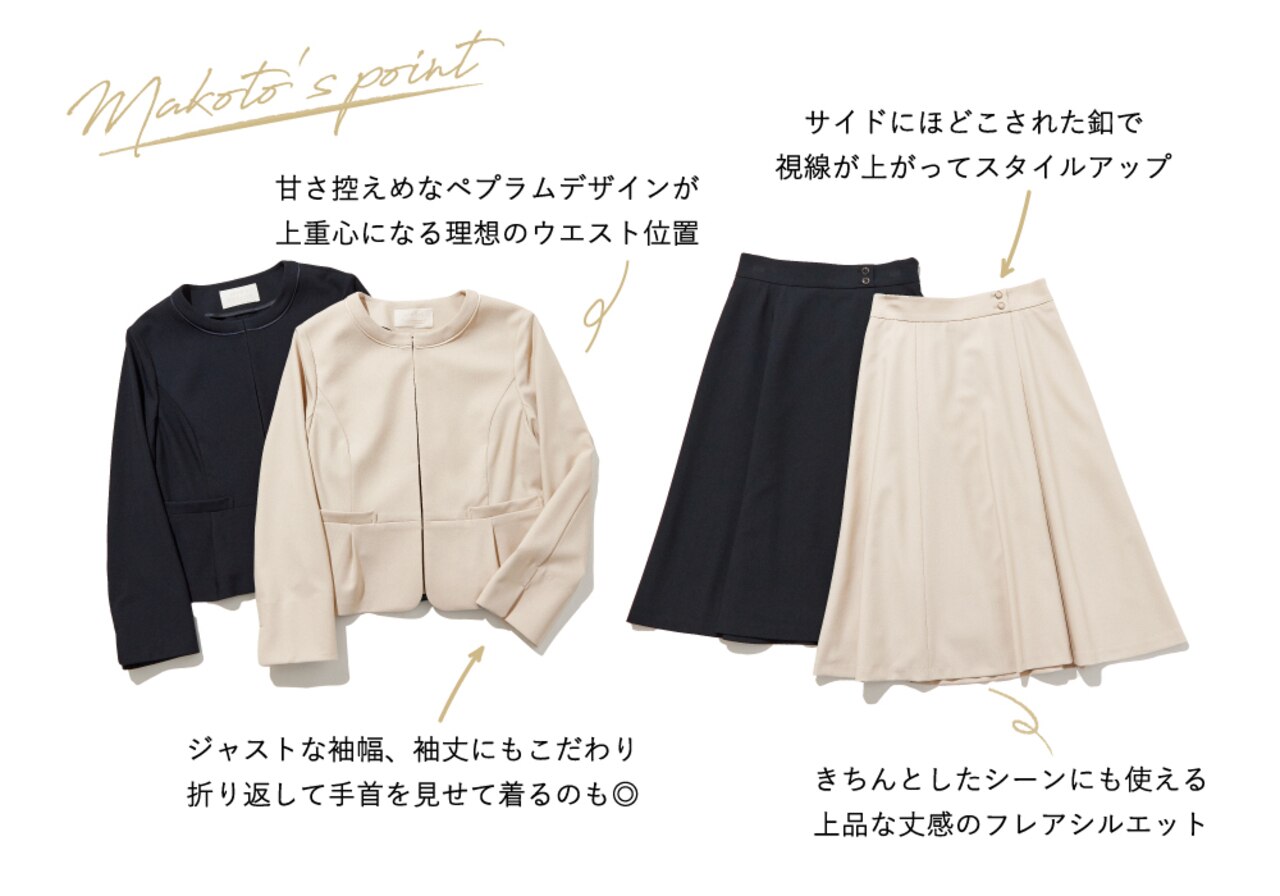 バックスタイルもフェミニンに演出するペプラムシルエットのジャケットと上品なフレア感のひざ丈スカートはセットアップとしてはもちろん、単品使いでも着回し可能なアイテム。