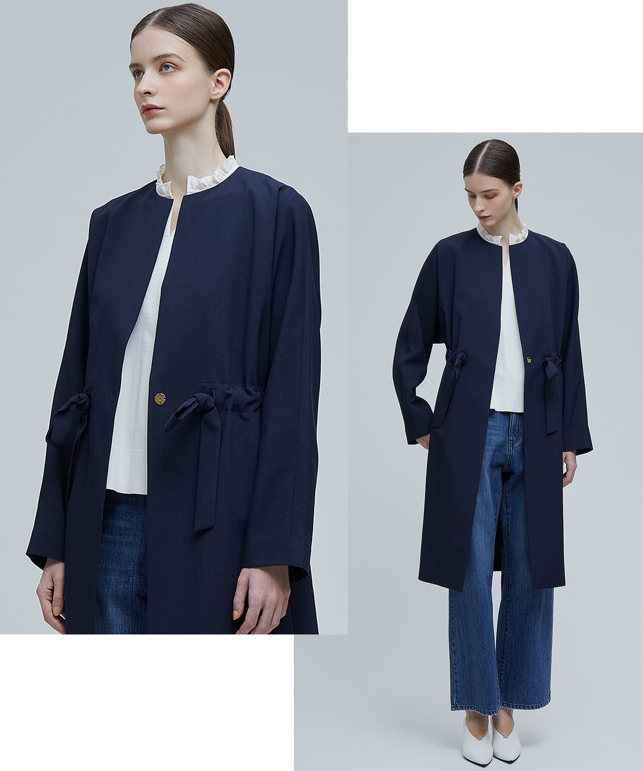 甘めなデザインのコートをストライプブラウス×デニムと合わせた甘辛コーディネート。コートはゆったりとしたサイズ感でいつものサイズよりワンサイズ下げてすっきりとさせるのも。ネイビーをチョイスして格好良さをプラスしました。