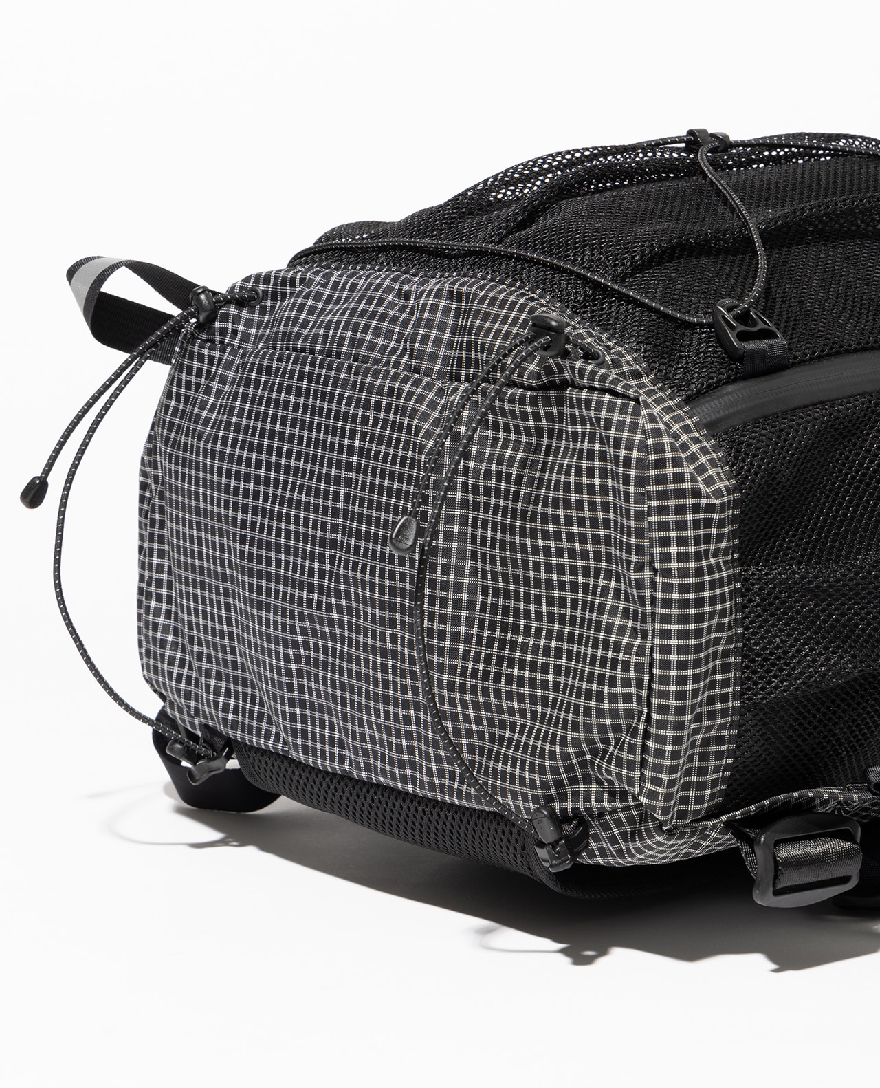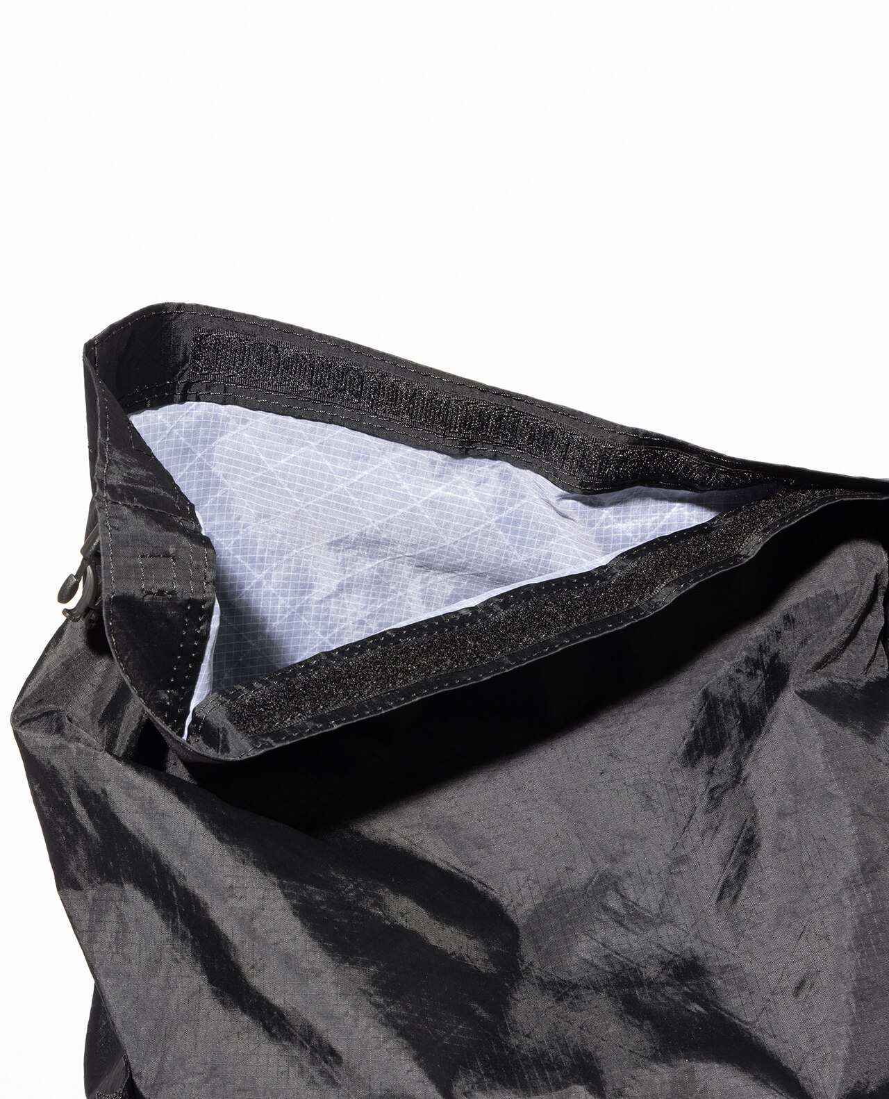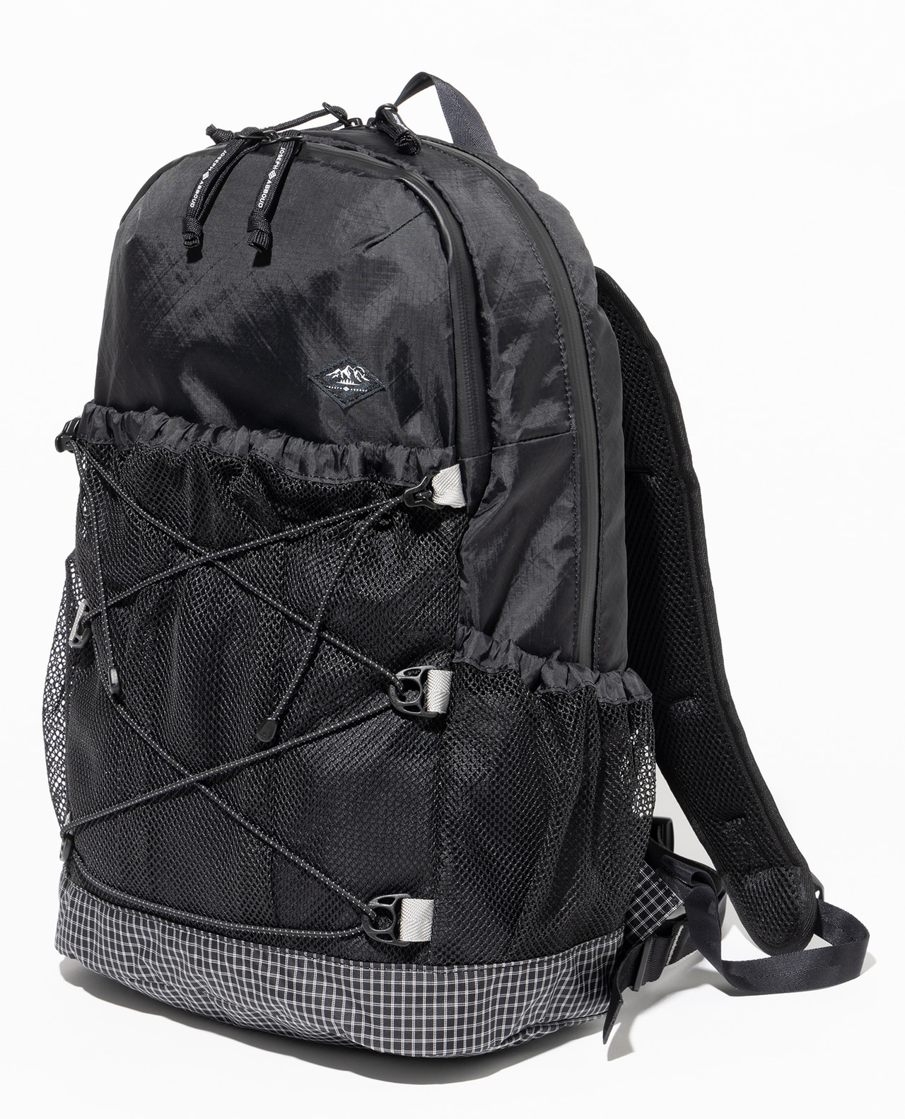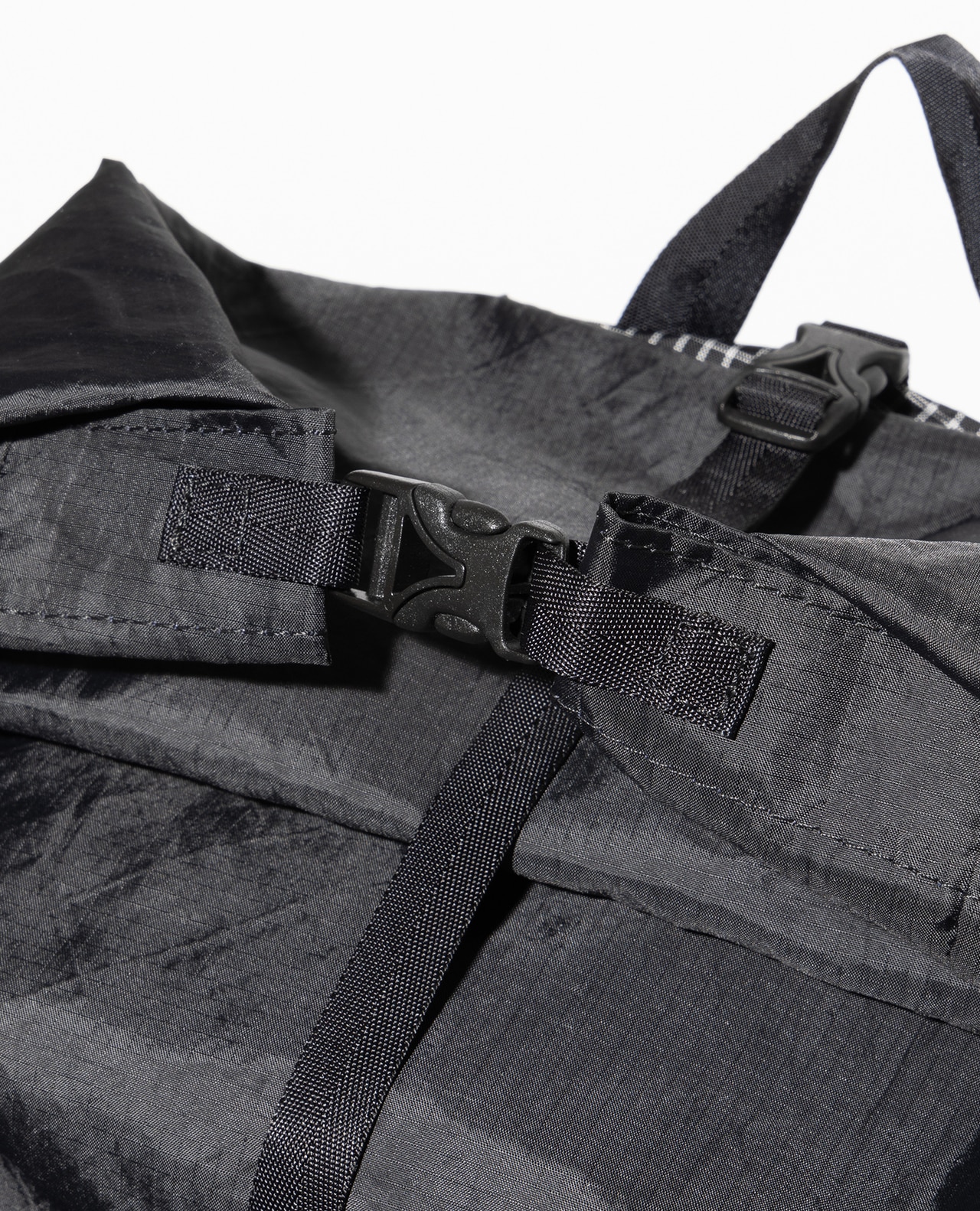 セットレース、カイトなどマリンスポーツ向けの高性能超軽量素材の盟主であるアメリカのCHALLENGE SAILCLOTH社の70dリップストップの生地をブラックのメイン、白い格子が織り込まれたUltra Gridをサブに使用。70dリップストップはより良いステッチ保持と優れた強度を備えています。100%リサイクルポリエステルを使用し、撥水加工にはC0 DWRのサスティナブル素材です。