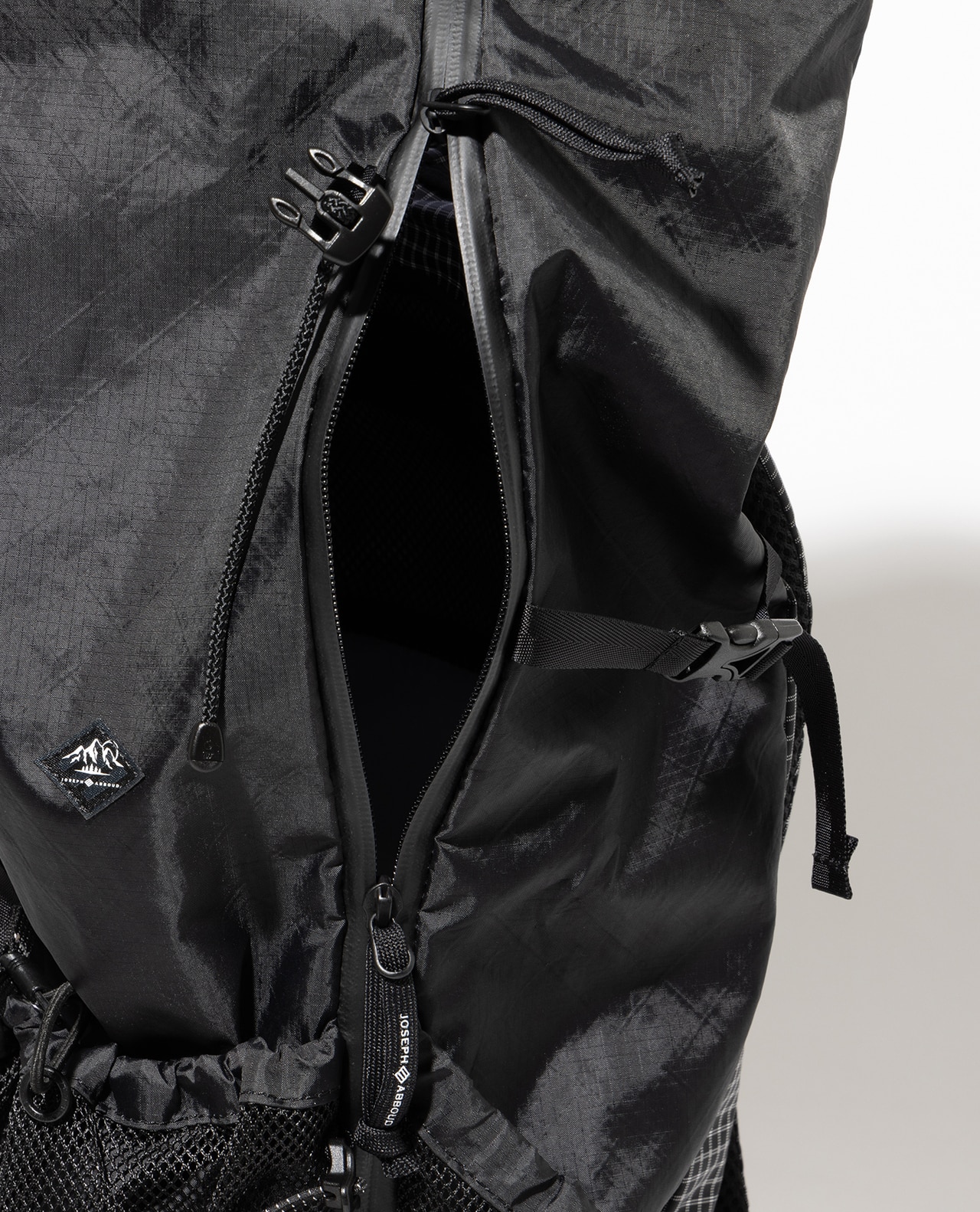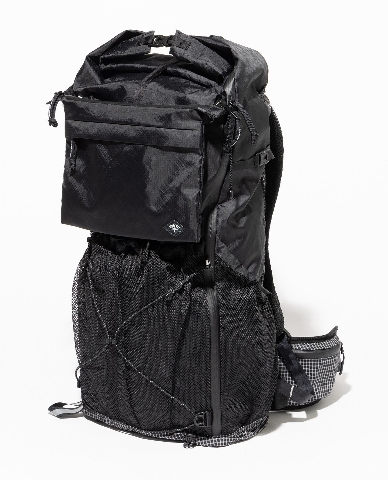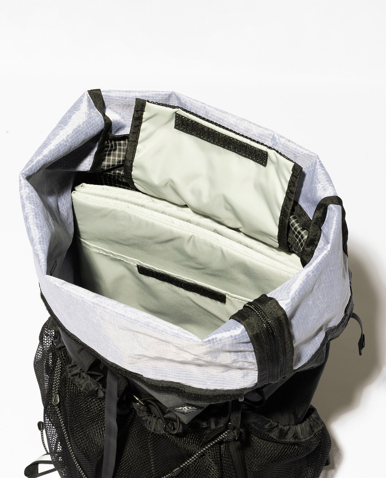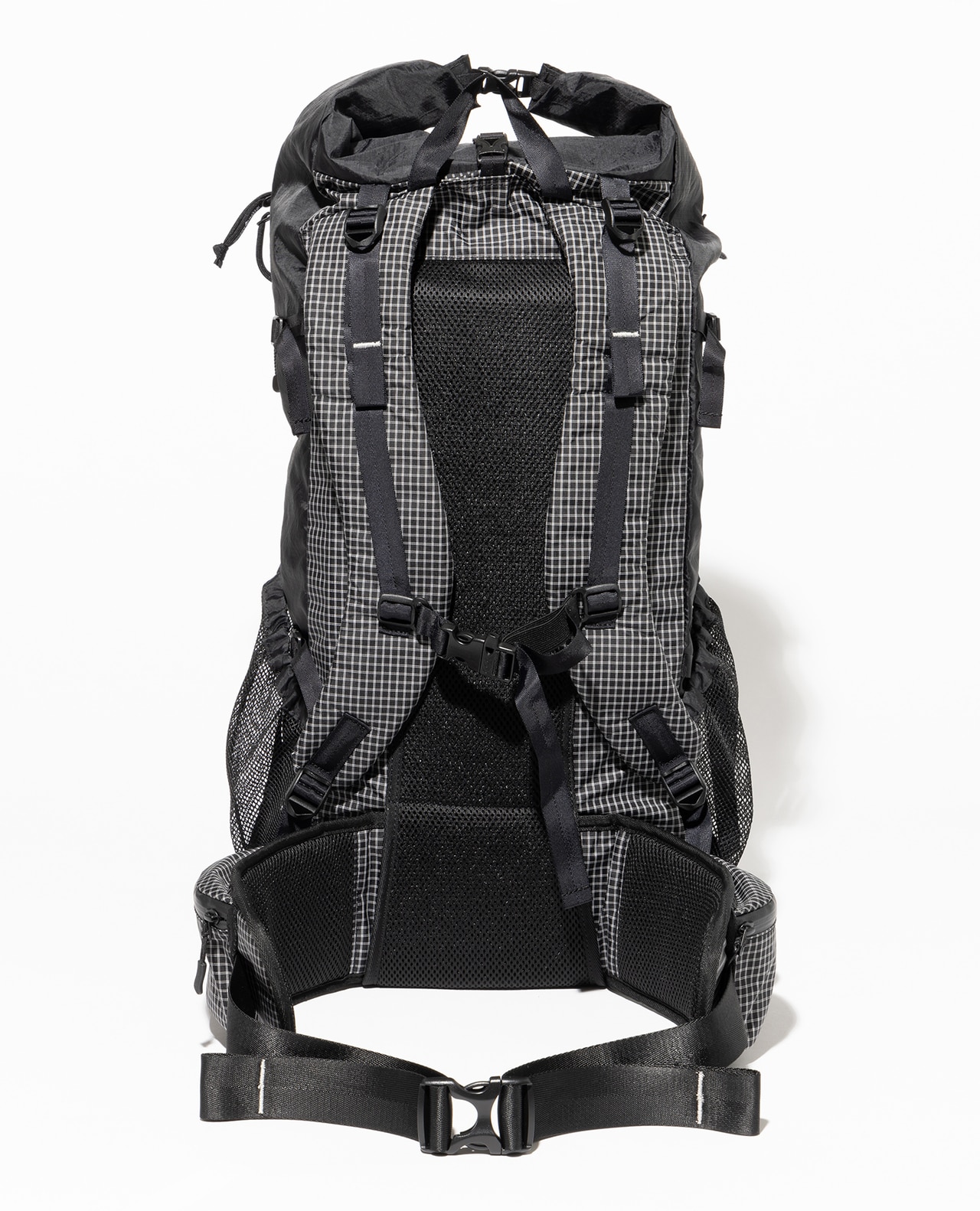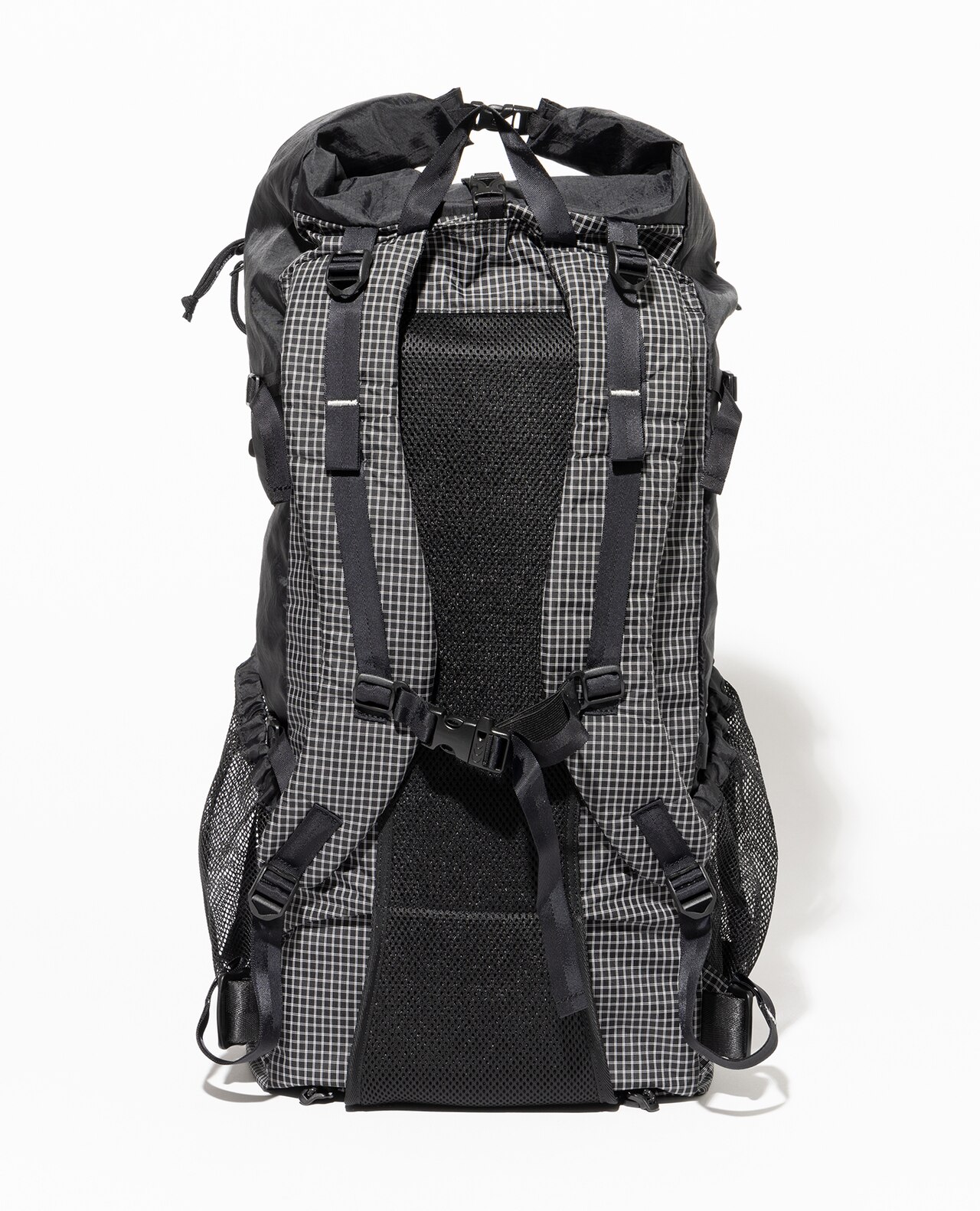 セットレース、カイトなどマリンスポーツ向けの高性能超軽量素材の盟主であるアメリカのCHALLENGE SAILCLOTH社の70dリップストップの生地をブラックのメイン、白い格子が織り込まれたUltra Gridをサブに使用。70dリップストップはより良いステッチ保持と優れた強度を備えています。100%リサイクルポリエステルを使用し、撥水加工にはC0 DWRのサスティナブル素材です。