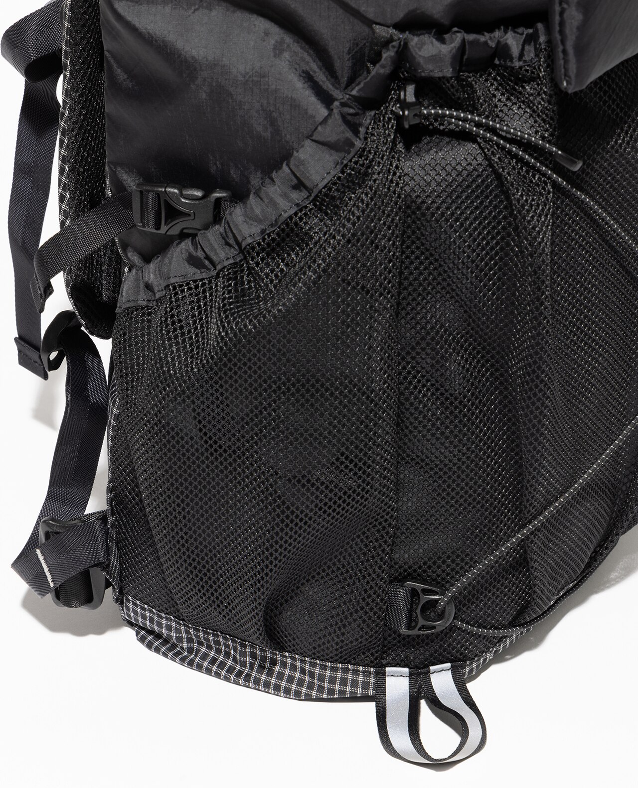 大容量のサイドポケット。荷物を取りこぼさないよう調整できるコードが付いています。ストックループ付きでギアを装着可能。タウンユースでは傘を装着すれば両手が空くため、サイクリングなどでもおすすめです。