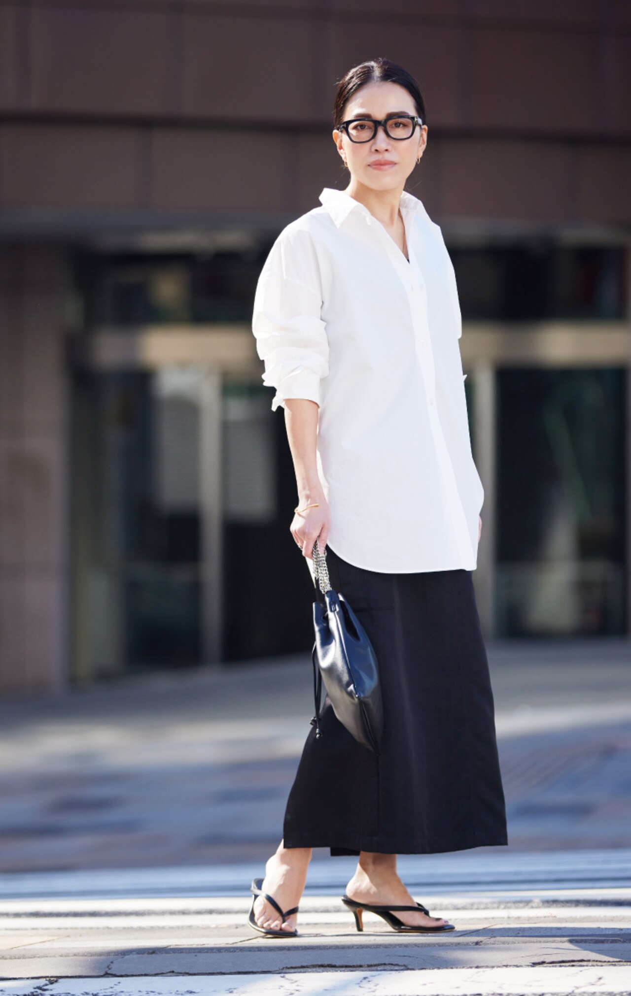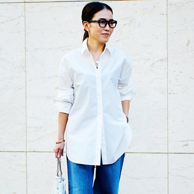 白シャツ×タイトスカートのシンプルな合わせは、フォーミングが大切。360°どこから見ても立体的に見えるようにするのがポイントです。後ろ襟を立てて、ざっくりと襟を抜いて着ることで顔回りを華奢に。袖をたくし上げてボリュームを出せば、メリハリのきいたシンプルコーデの完成です。シャツのフォルムが引き立つように、色はモノトーンでの提案です。