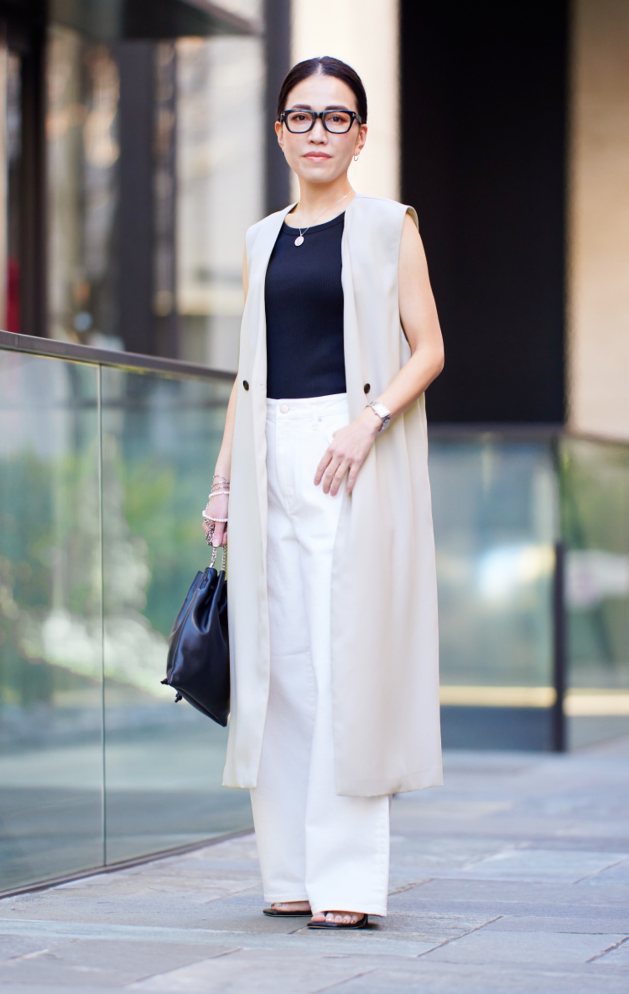 取り入れるだけでスタイルアップできるロングジレは、太めのパンツと合わせるのが今年っぽいなと思っています。隠れる面積が大きい分、普段ワイドパンツを履かない方でも挑戦しやすいですね。ホワイト・トープ・ブラックと、ベーシックカラーでまとめることで、より大人っぽく決まるように意識しました。