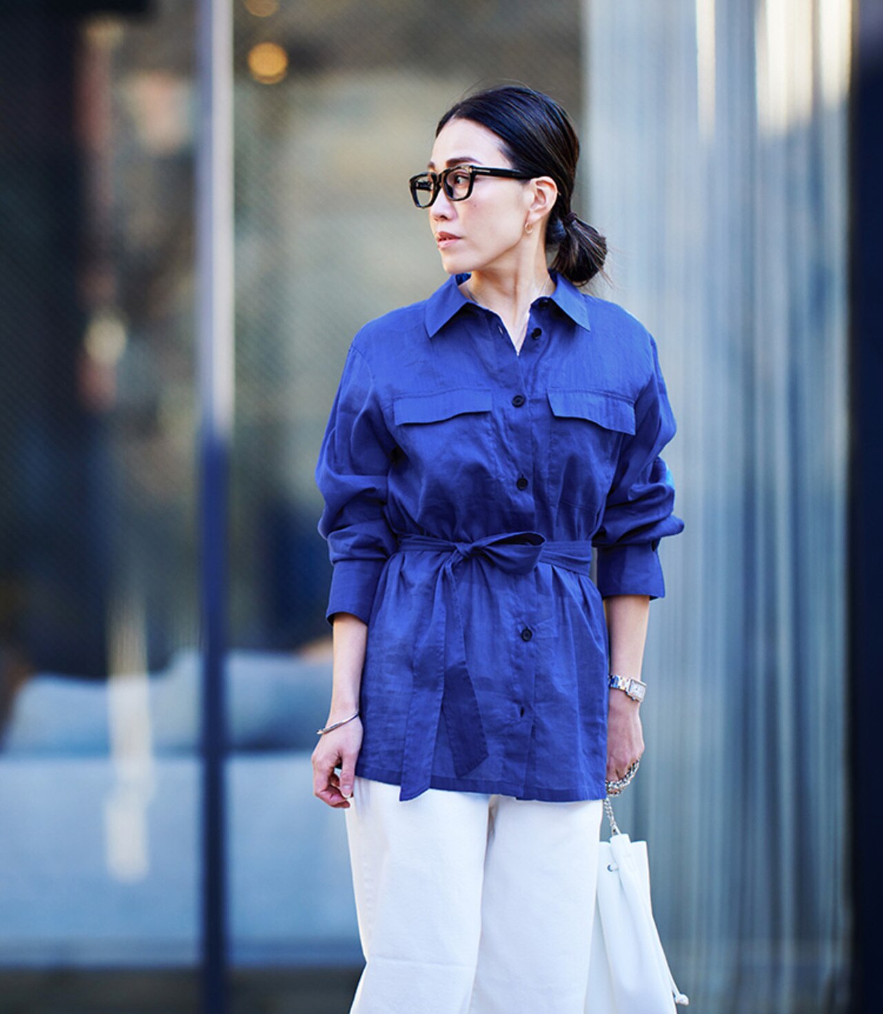 夏に映えるブルーブラウス。ICBではおなじみのカラーです!いつもは濃色と合わせることが多いのですが、今期は白で爽やかに着こなすのが気分。バッグも白にして、ツートンでまとめることでブルーが引き立つように意識しました。ブラウスはシアー感がある天然素材なので、程よくエレガントな雰囲気。共素材のベルトでウエストマークすれば、フォルムの変化も楽しめるお気に入りです。