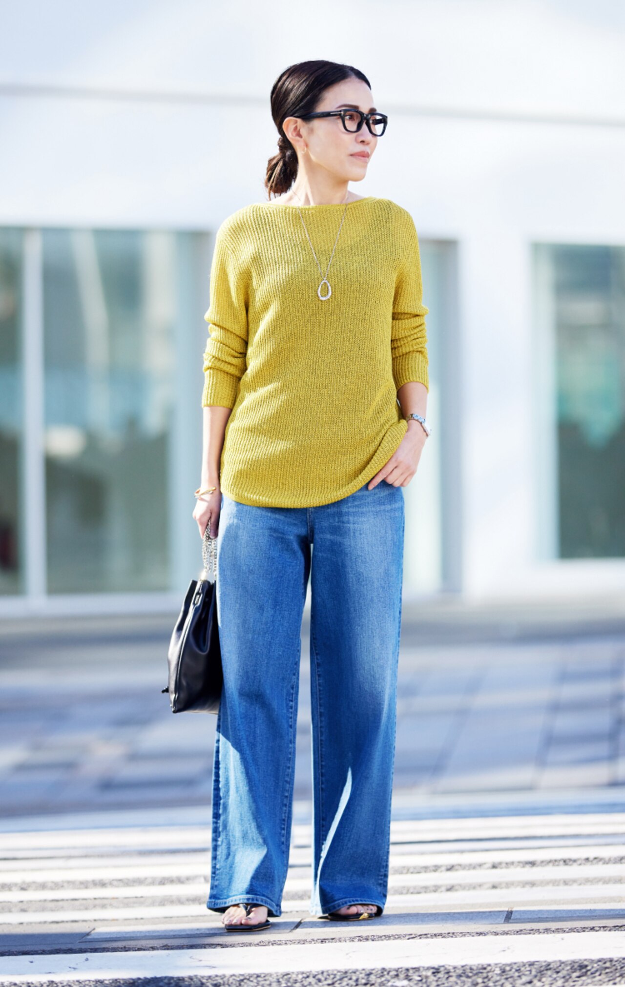 元気な印象になりがちな黄色ですが、少し青みがかったものを選んだり、ニット素材のものを選ぶと大人っぽく着られます。今回はブルーデニムと合わせて、デイリーにも使いやすい、抜け感のあるコーデにまとめました。