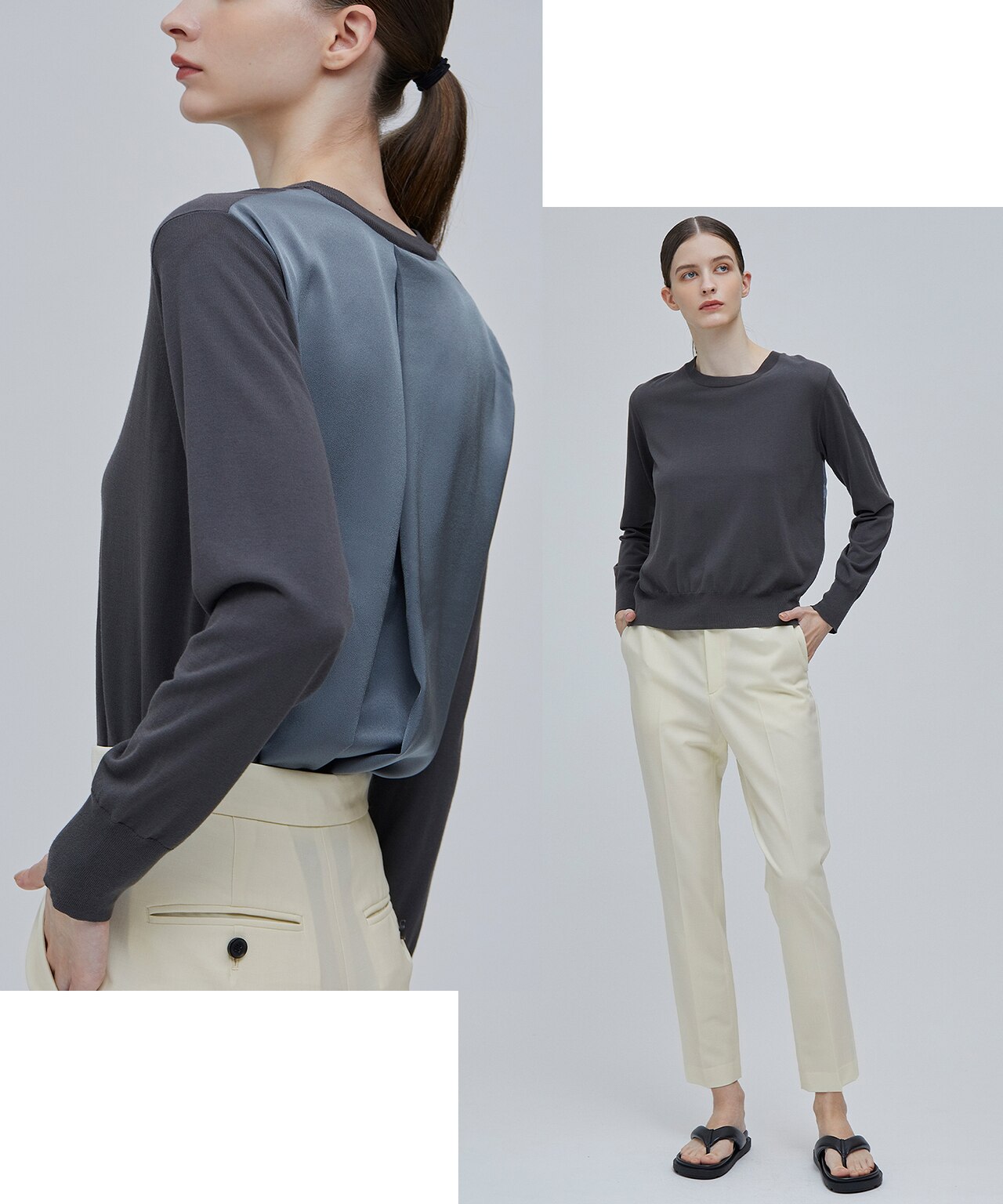 後ろ身頃をサテンにすることで、おしゃれ感はもちろん、さらりと涼しい清涼感のある一枚に。着るだけでツヤのある上品さを加えてくれるデザインニットです。