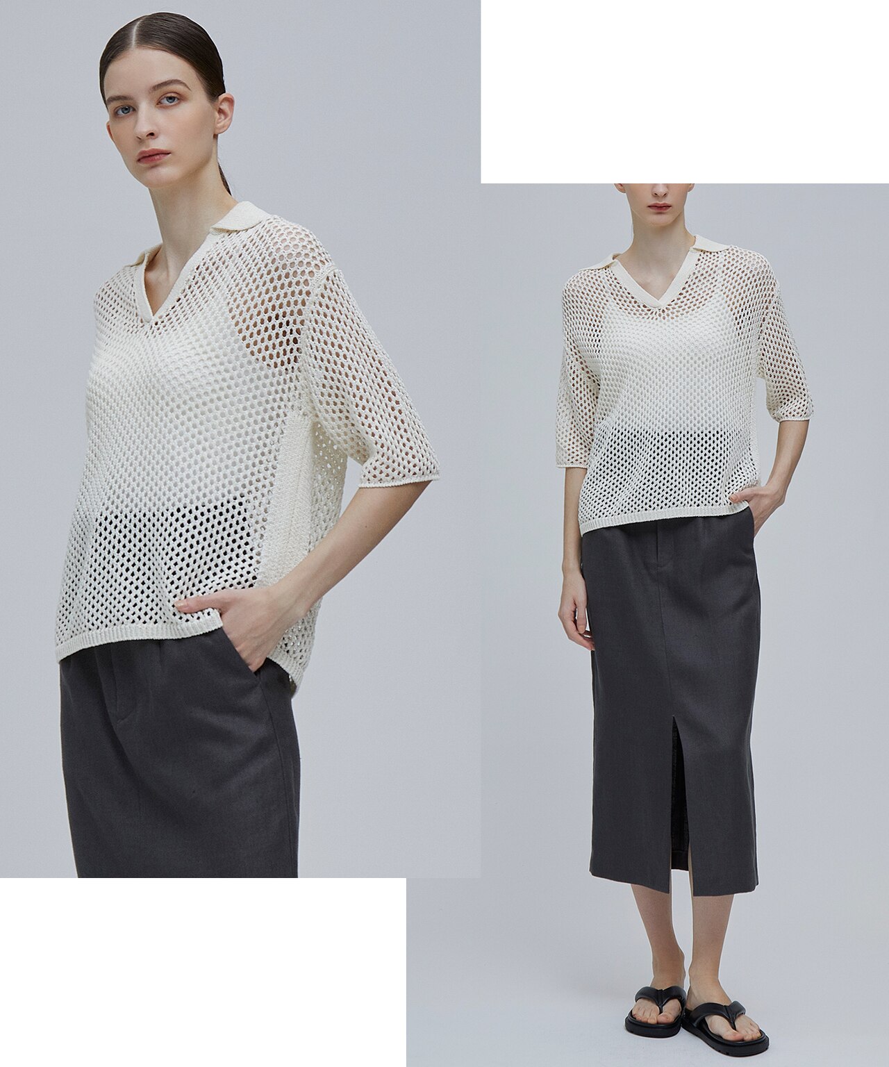 ポロデザインをメッシュ編みにすることで、カジュアルながら女性らしい印象に。シンプルなタンクやキャミワンピースの上にさらっと合わせるだけで、今年らしいレイヤードスタイルが完成。