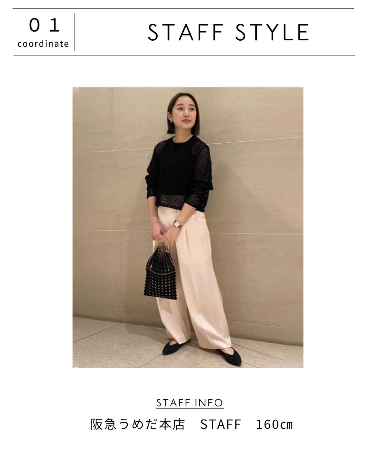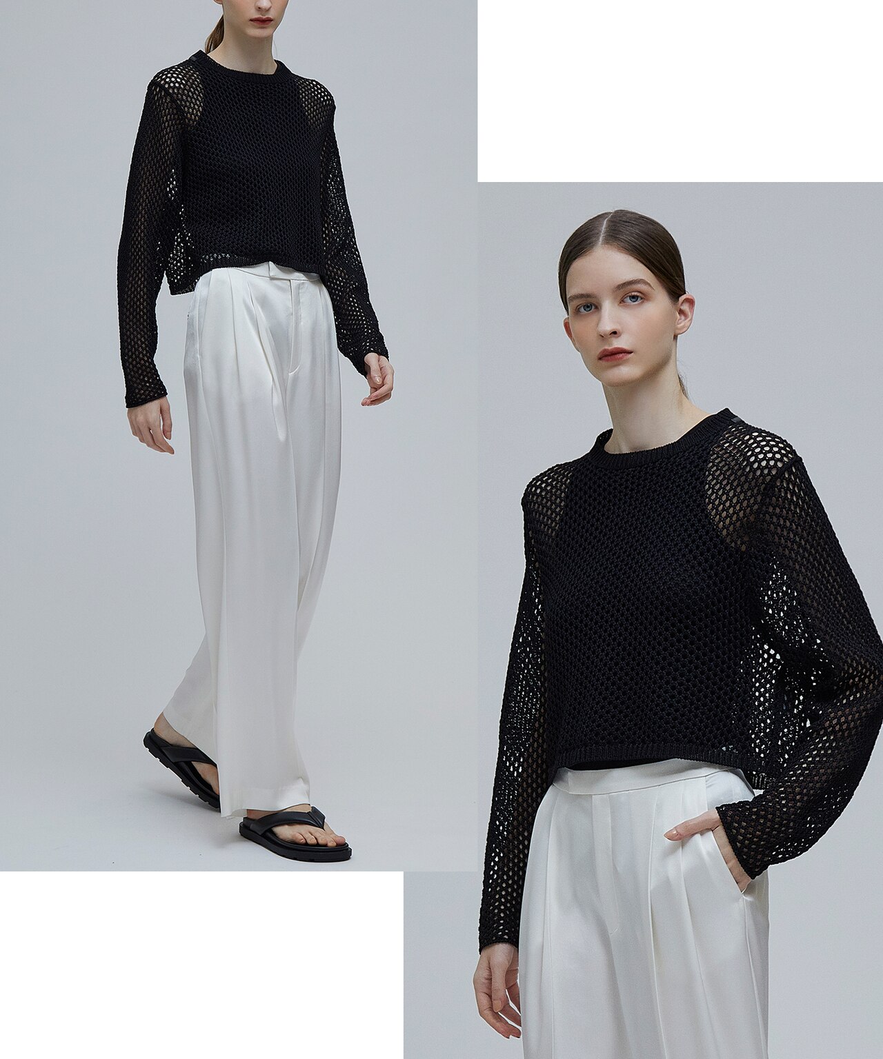 トレンド感のあるメッシュニットに、サテンが上品なピンクのワイドパンツを合わせ綺麗めカジュアルコーデ。黒×ピンクで可愛くなりすぎない大人の抜け感を演出しました。短めの丈感で、スカートやワイドパンツとの相性が抜群。腕や身幅はゆとりがあり、インナーも重ねやすいです。