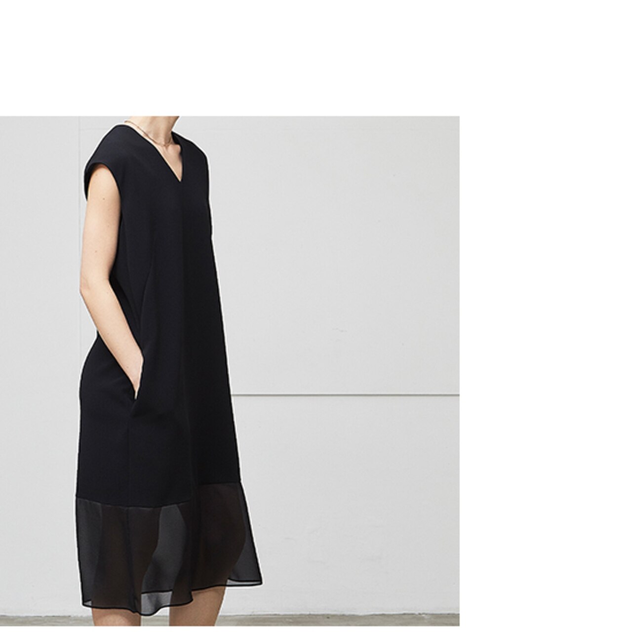 襟ぐりの同色レザーテープが顔周りにアクセントを効かせ、ゆったり目のシルエットが身体のラインを拾わず、長袖なので冷房除けにも使える安心感のあるデザイン。