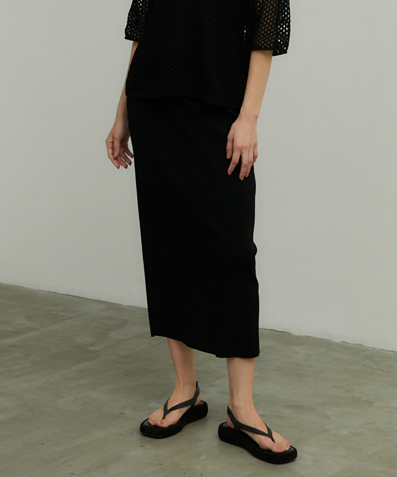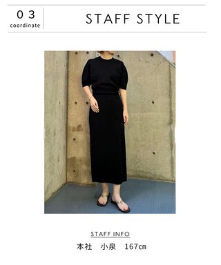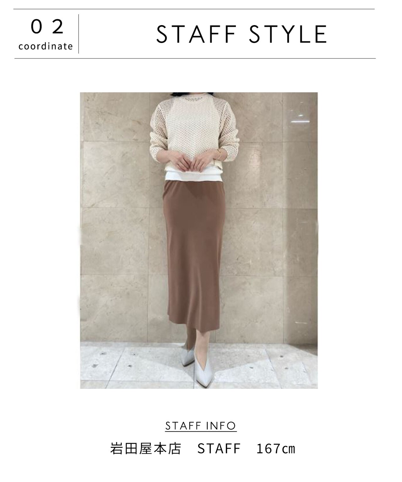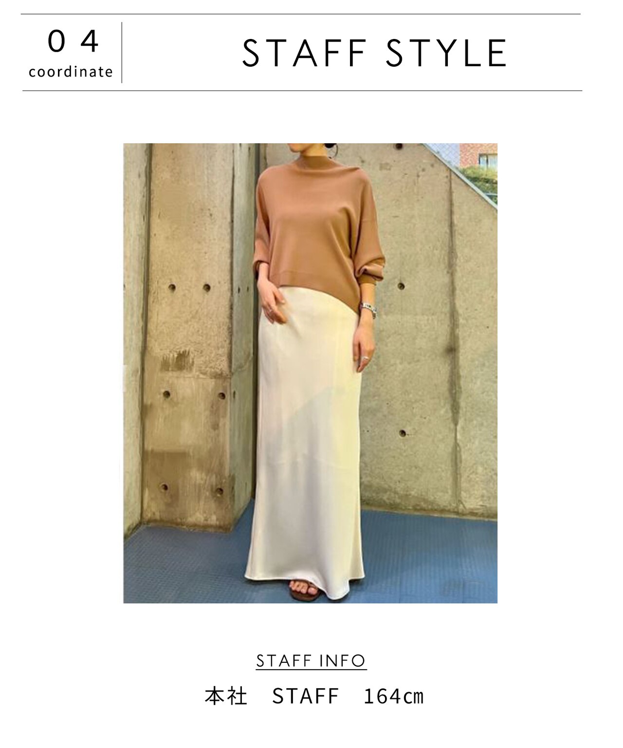 Iラインスカートは、ゆったりめのトップスとの相性抜群。程よい抜け感と女性らしさが溢れるメリハリコーデに。