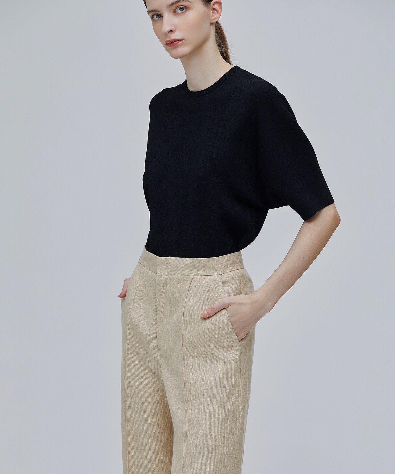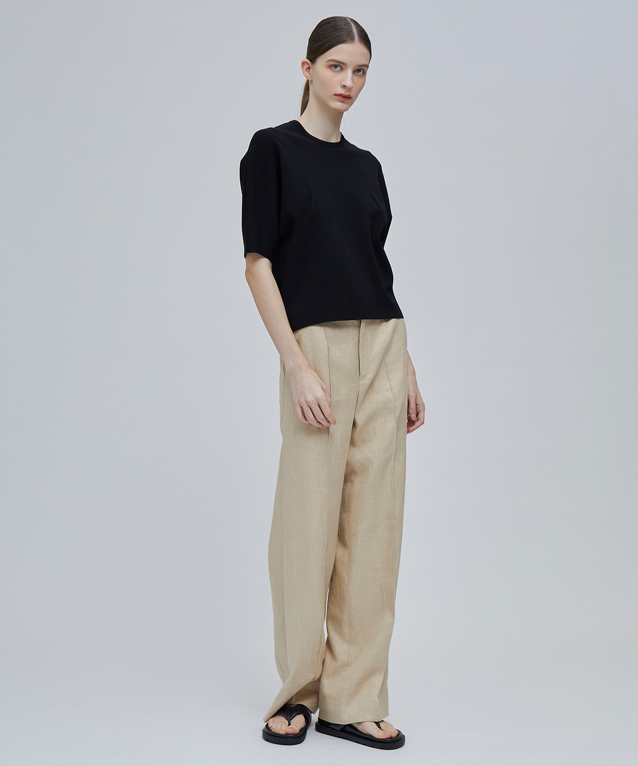 袖にふくらみを持たせた半袖ニット。フェミニンな雰囲気のあるデザインなので、あえて張り感のあるワイドパンツを合わせることで、程良く甘さを抑えた甘ニッシュコーデが完成。