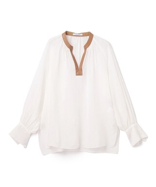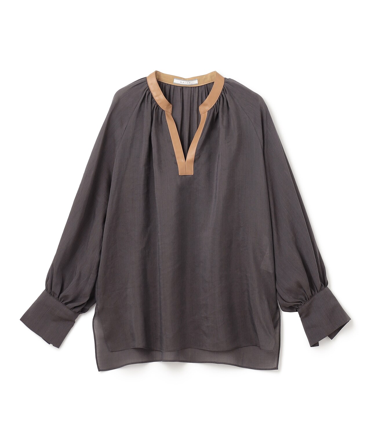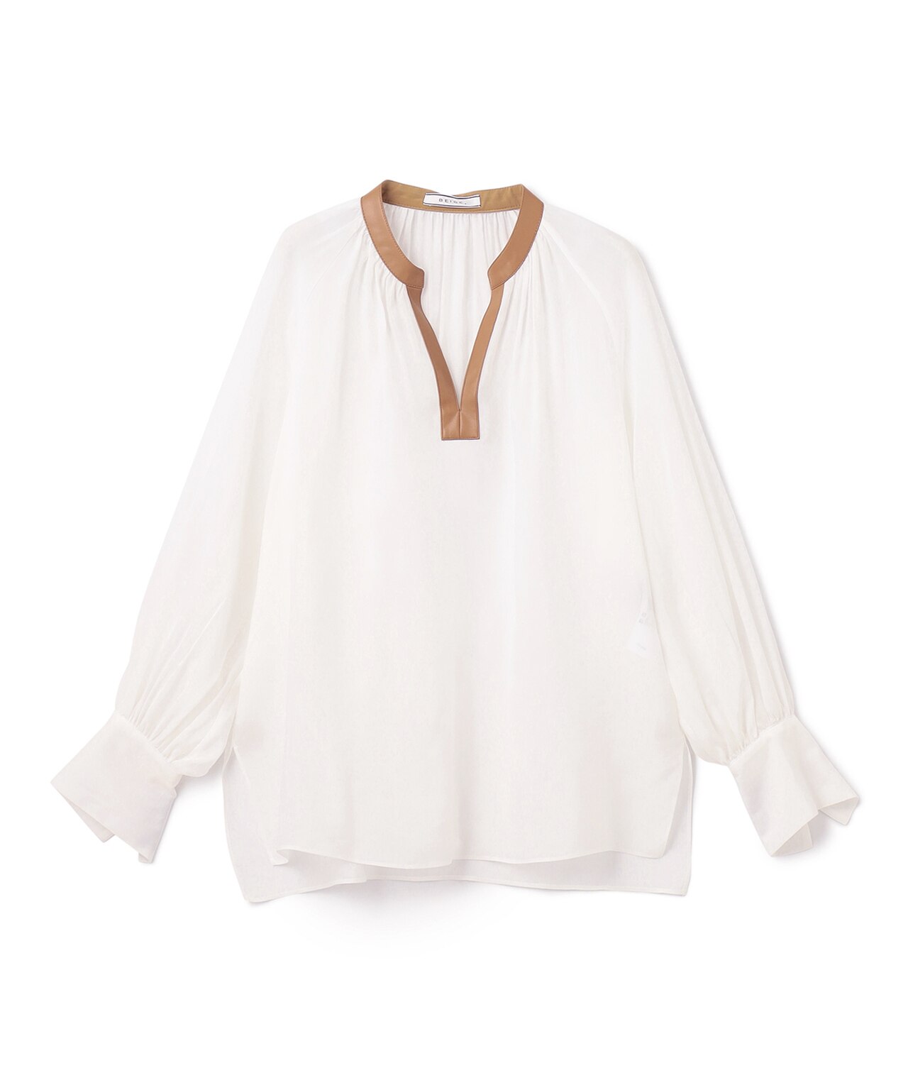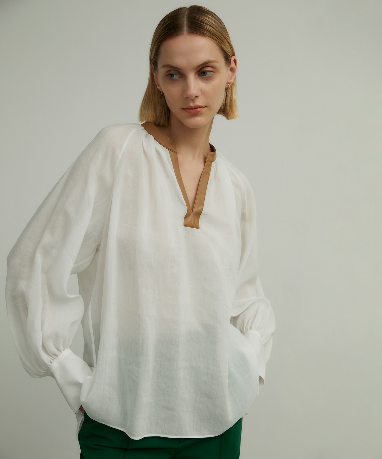 甘さがありながらもドライタッチでシャープな雰囲気のラミー×レザーブラウス。袖にはギャザーを入れてボリュームを出し、ゆったりとしたフォルムがこれからの季節に活躍する1枚。