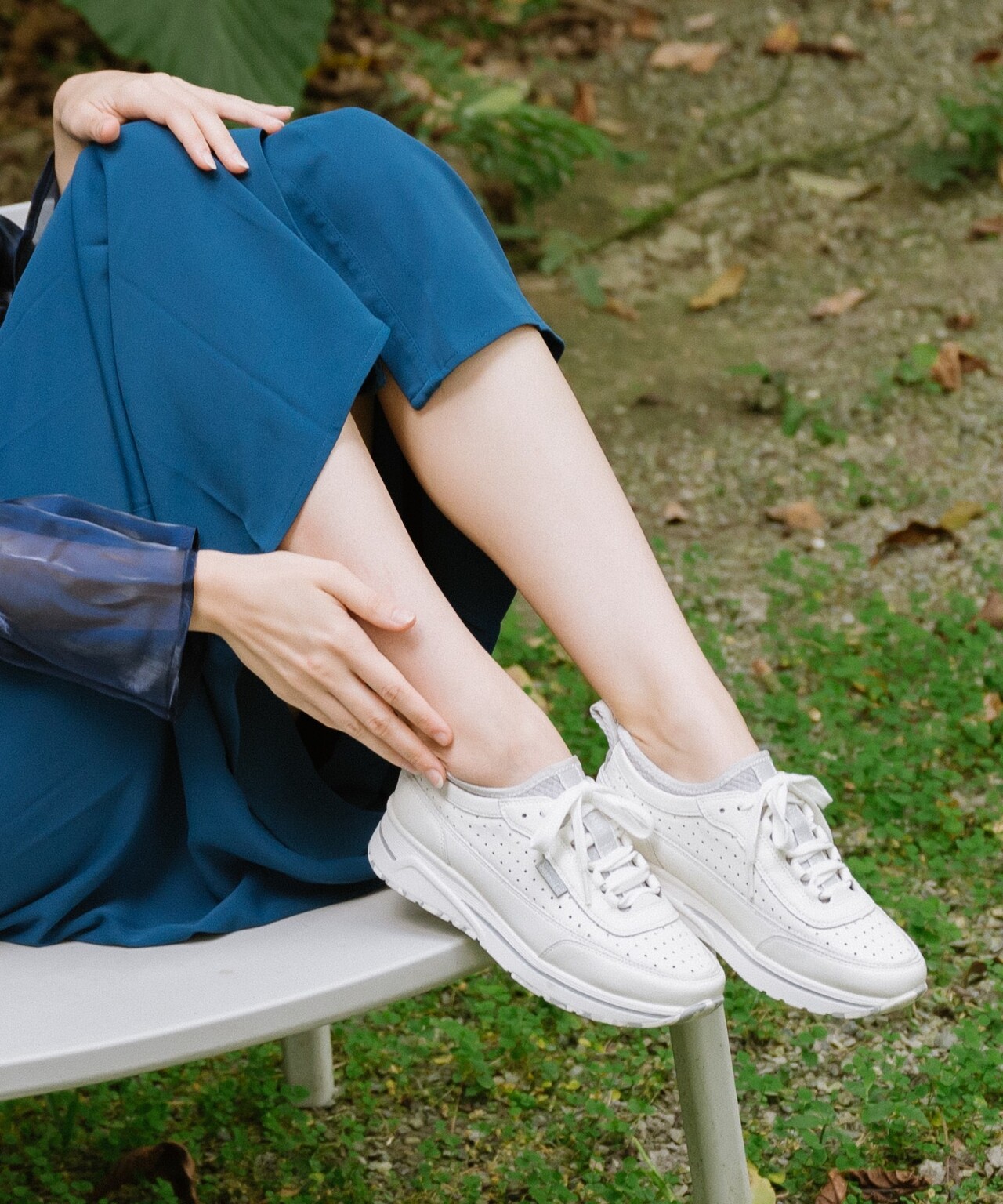 底面がラバー素材なので滑りにくく、履き口がストレッチ生地なのでフィット感がよく、ソフトな足あたり。【BUSSOLA】パンチングレザースニーカー【BUSSOLA】パンチングレザースニーカーINTER-CHAUSSURES¥21,450(税込) -