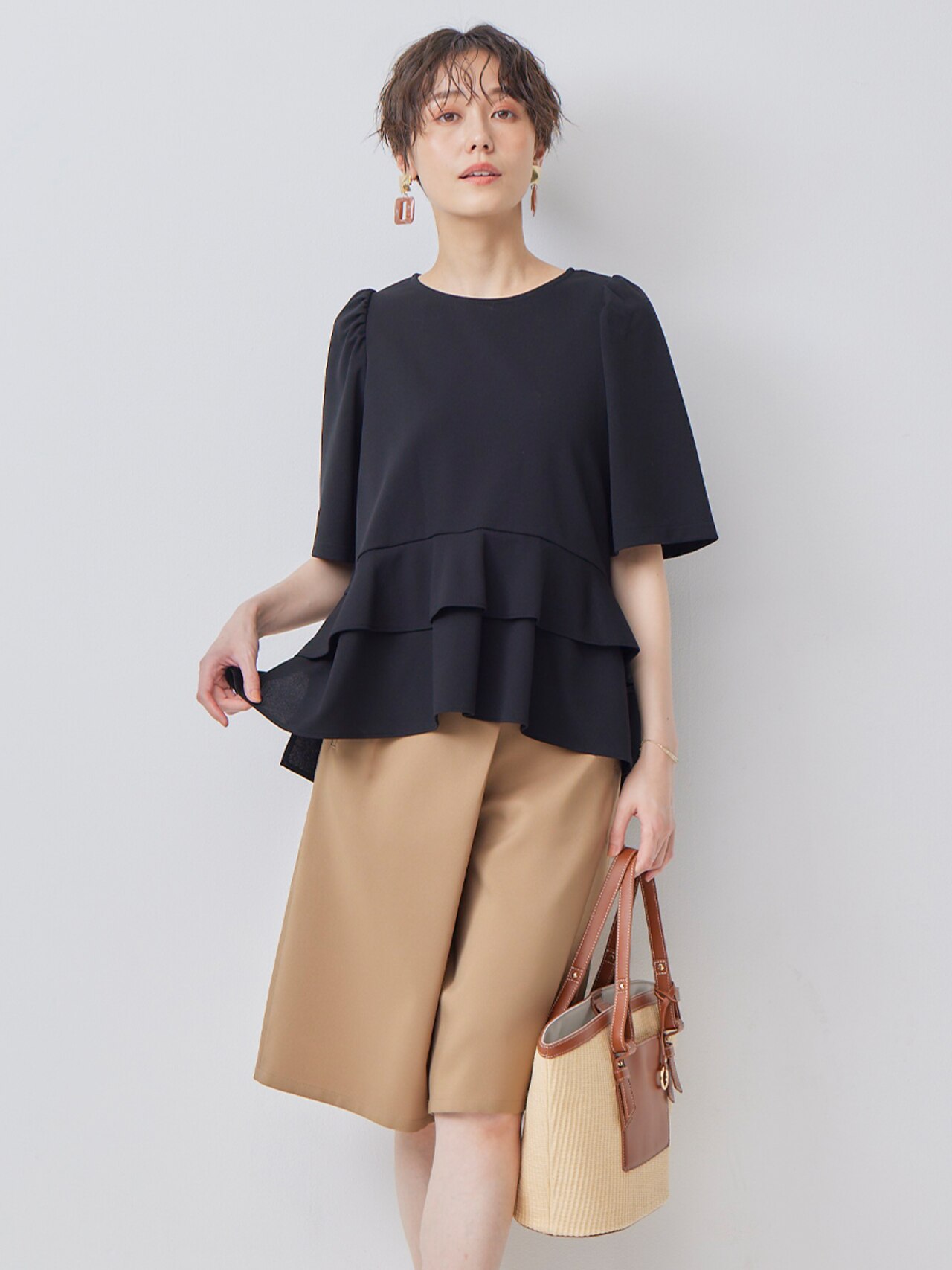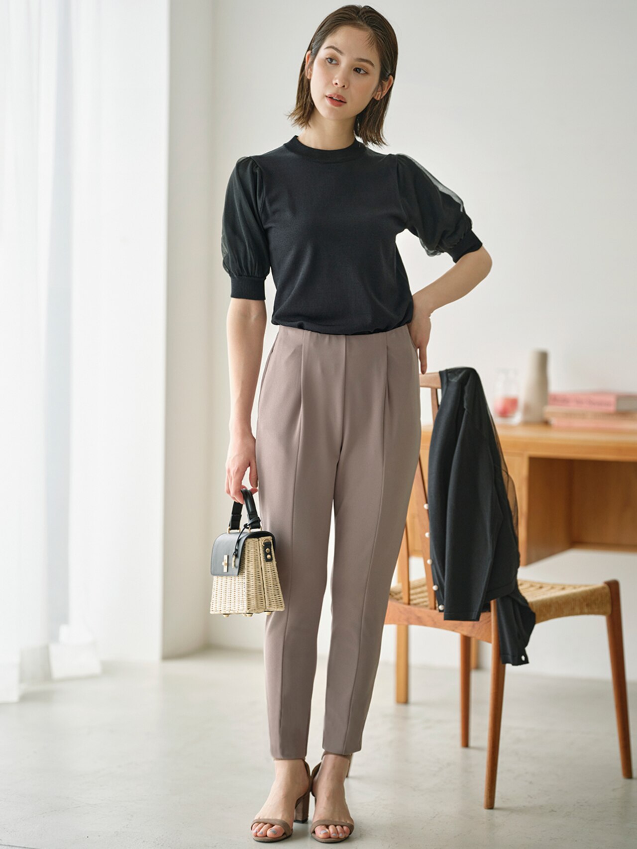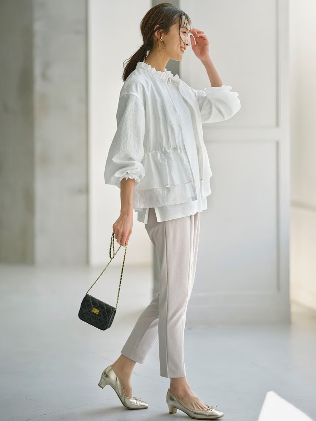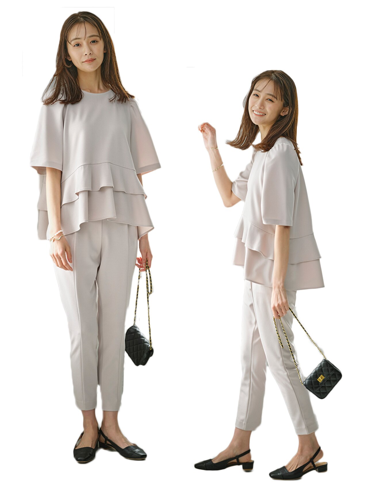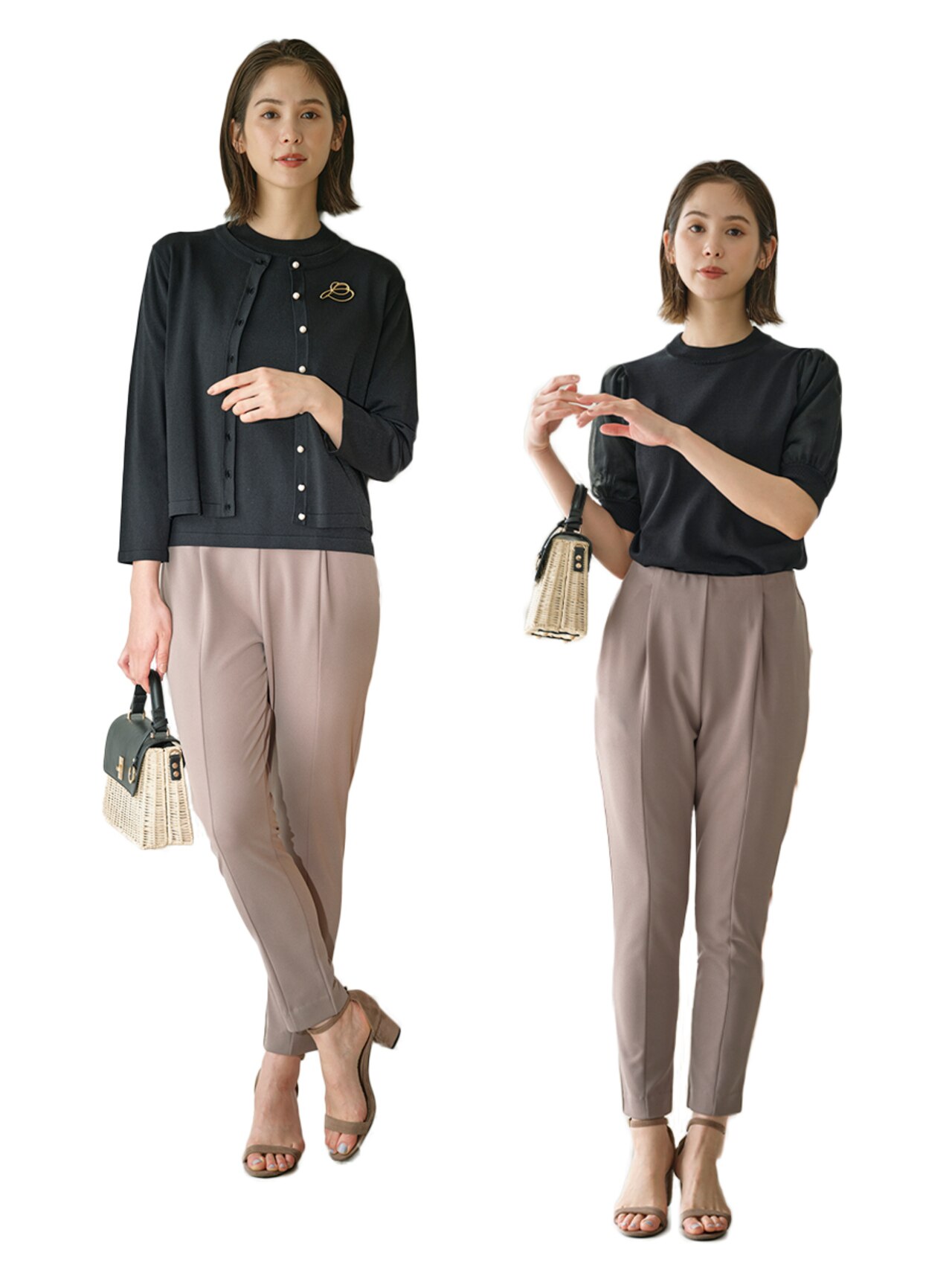 さらさらとした肌離れの良い風合いで、伸縮性があり動きやすく、ほどよい肉感で体のラインを拾いにくい素材。リラクシーな着心地ながらもきちんと見えが叶います!