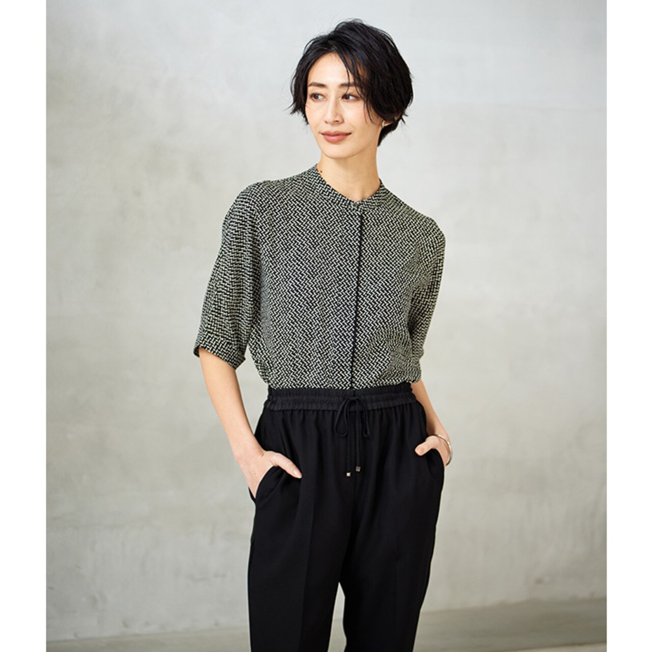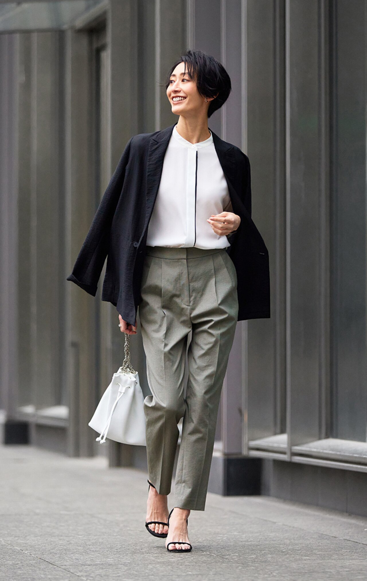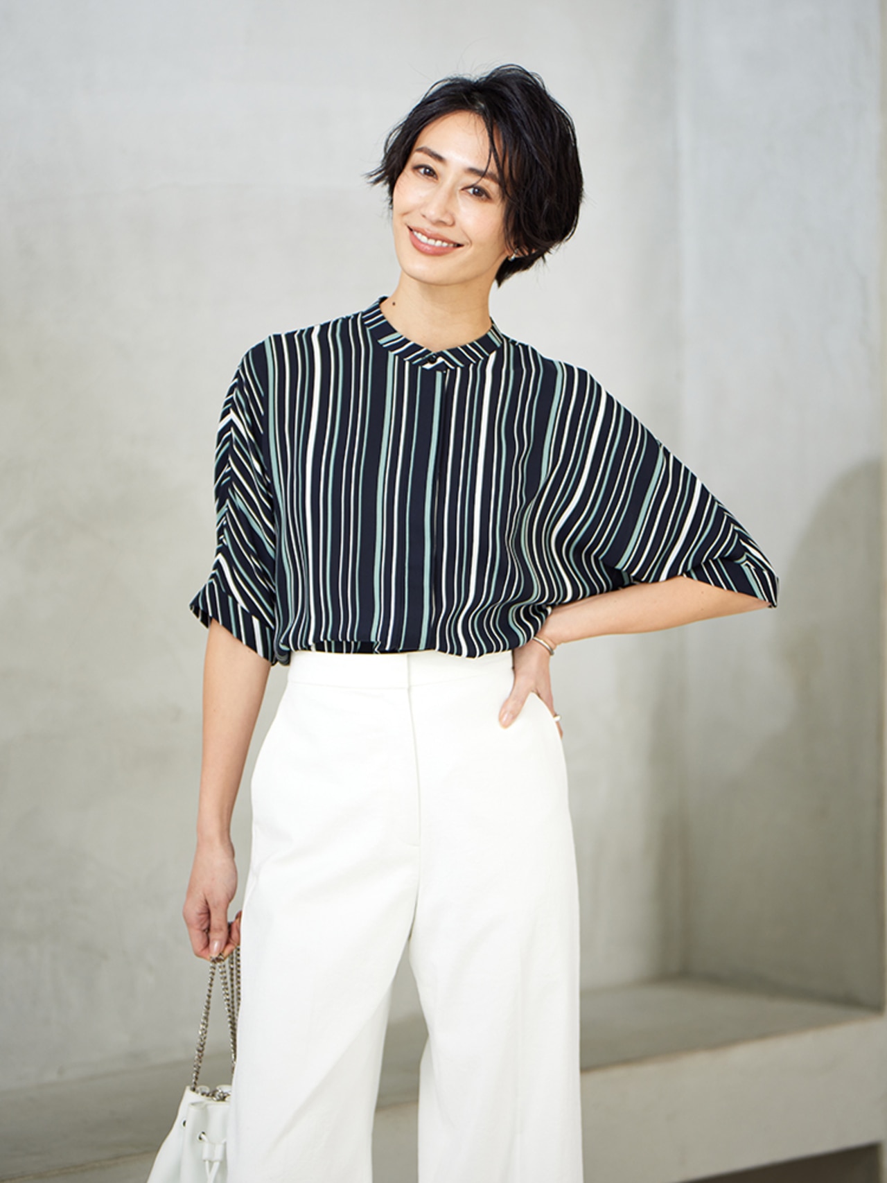 一枚は持っておきたい、シーンを問わず活躍する白のブラウス。ジャケットを羽織った定番スタイルも、品よく清潔感ある印象を叶えてくれます。