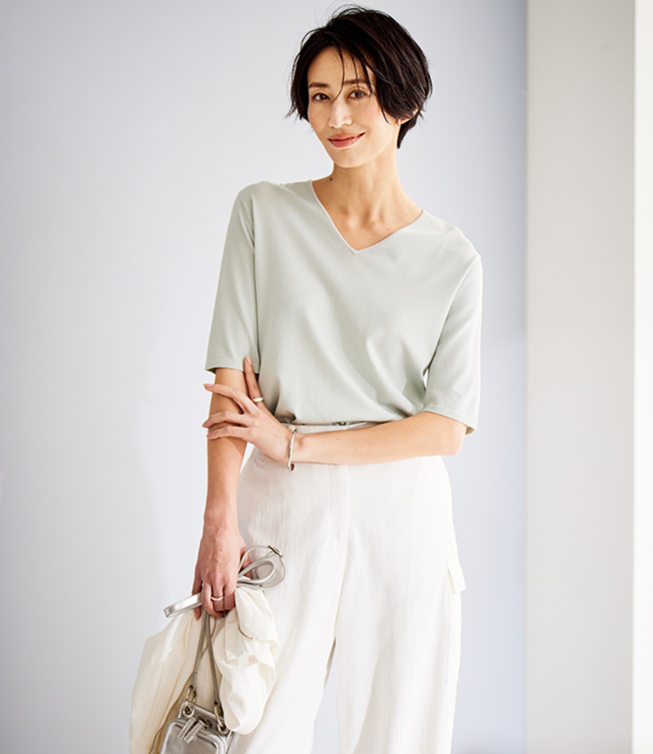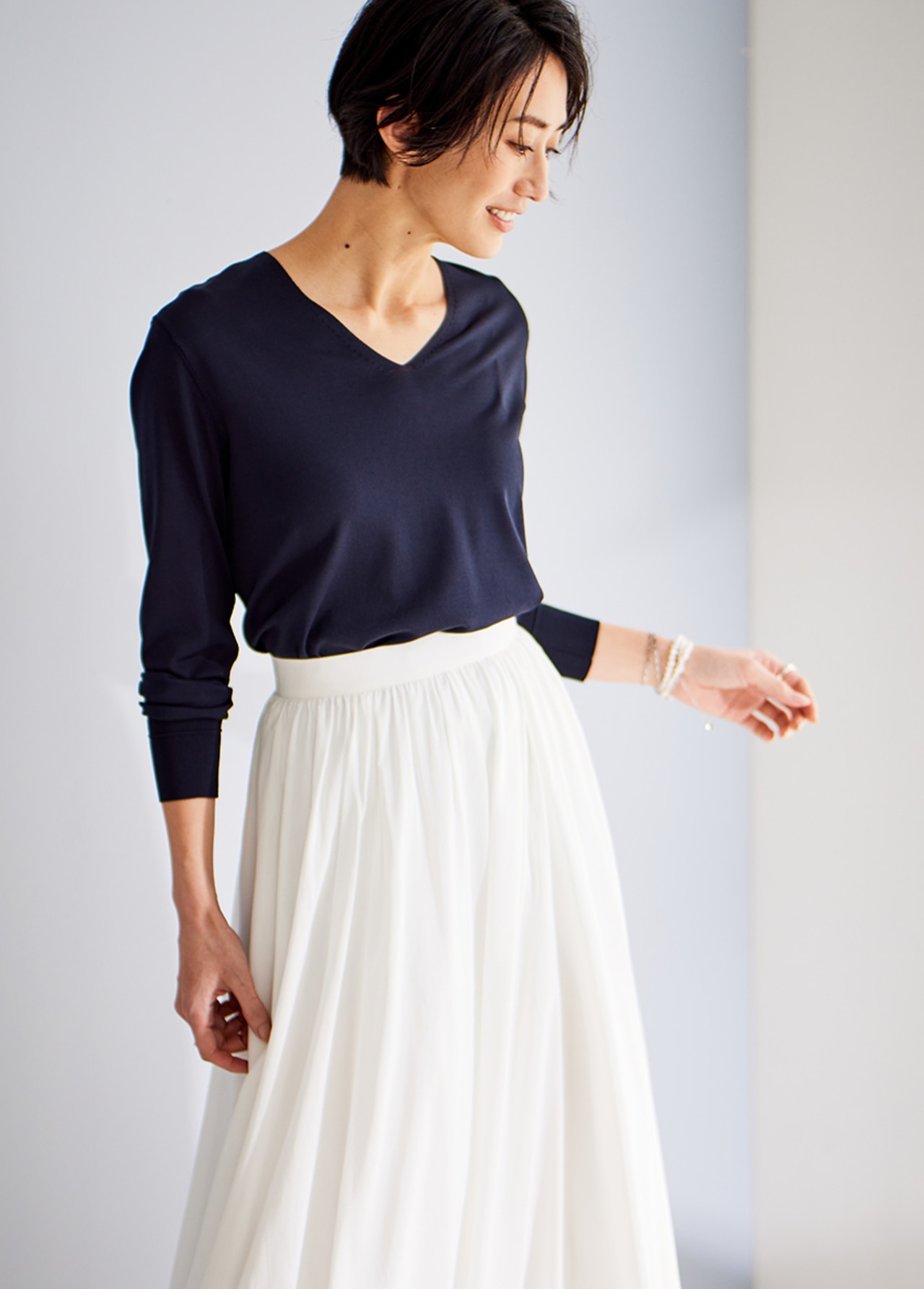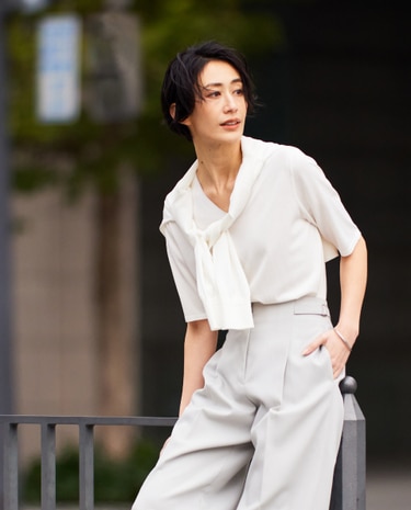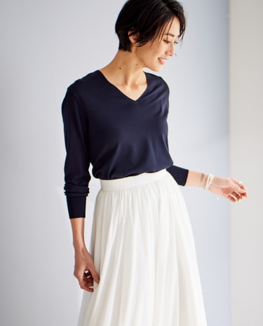 襟元をすっきり女性らしく見せるVネックトップス。
