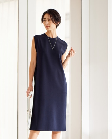 サイドが配色ステッチのクルーネックワンピース。
