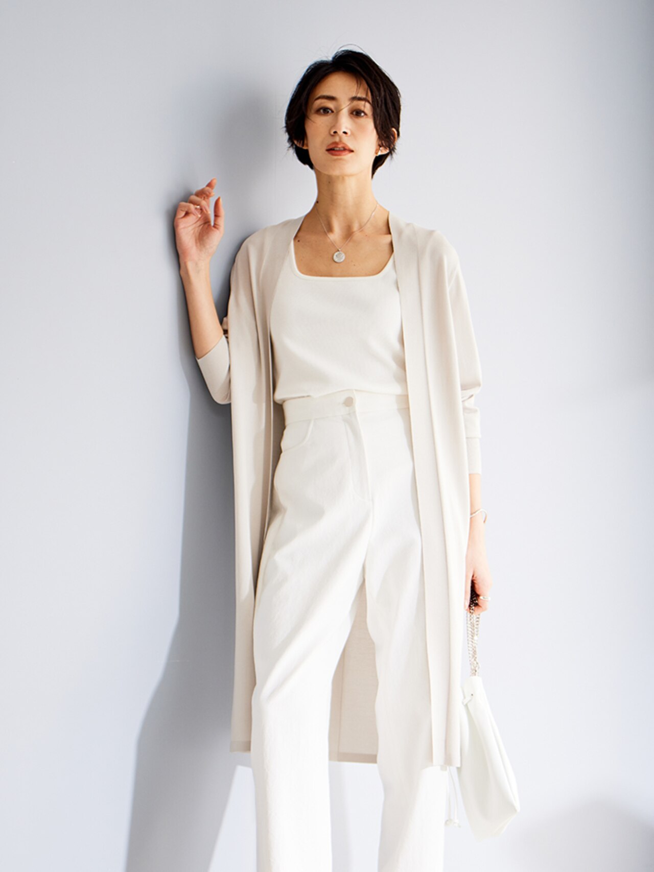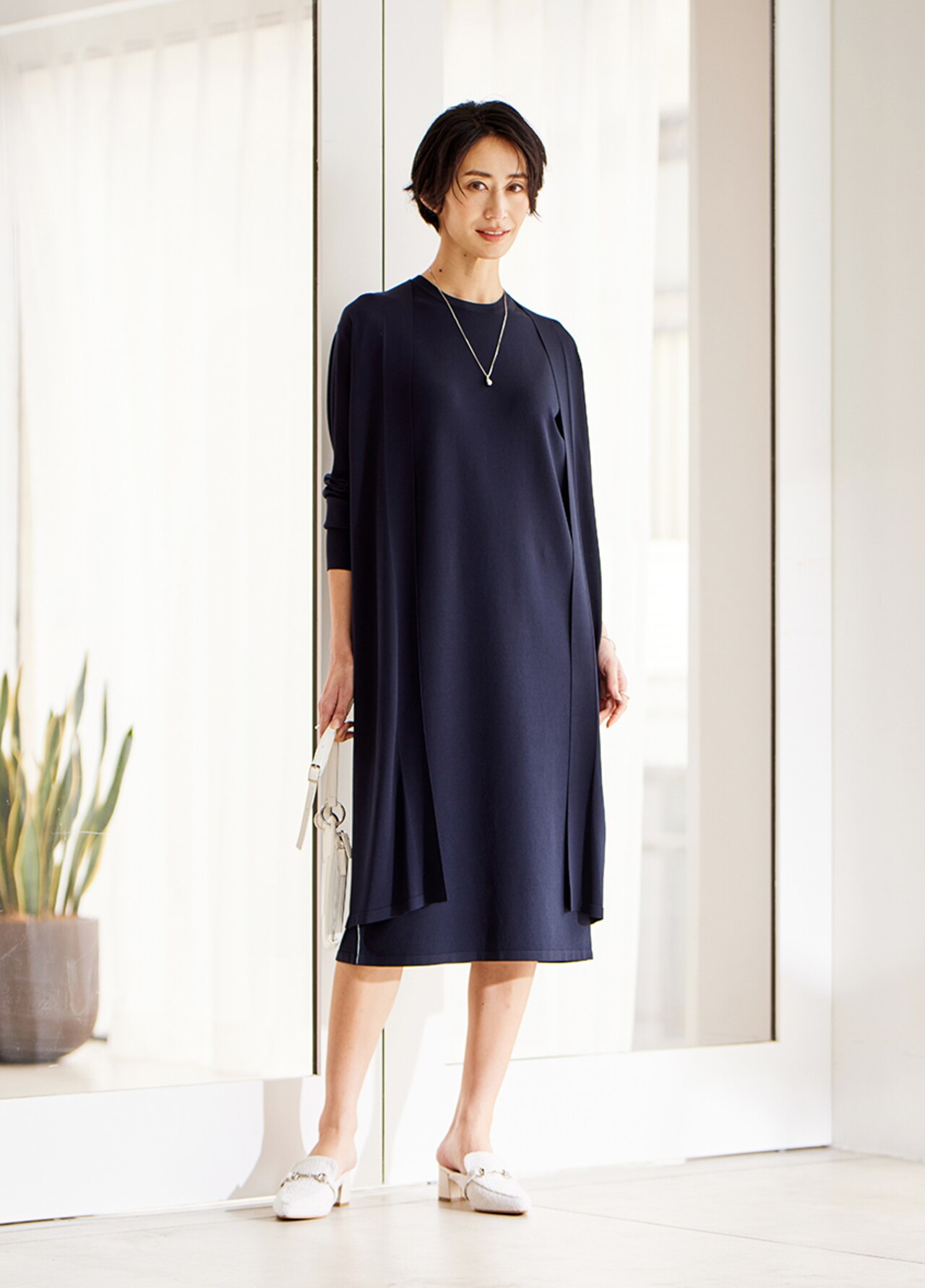 黄金比率のワンピ×カーディガンのアンサンブルは