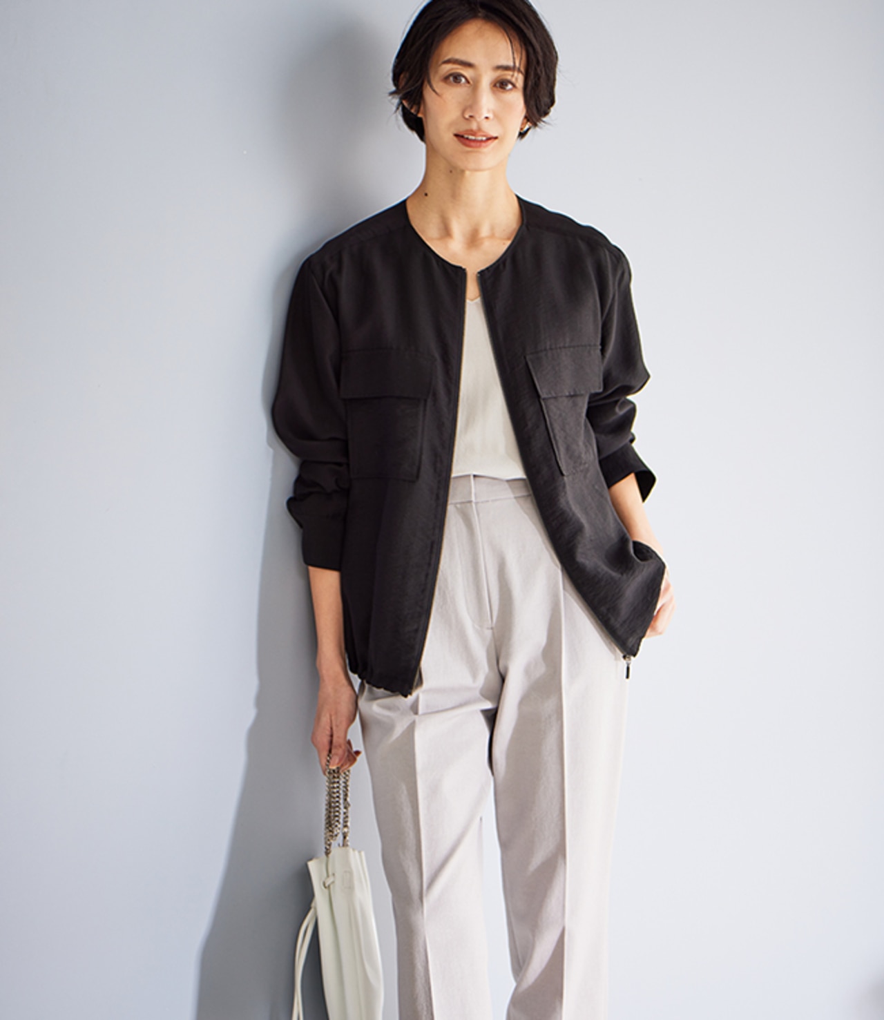 ブラックのブルゾンで辛口モードな印象に。