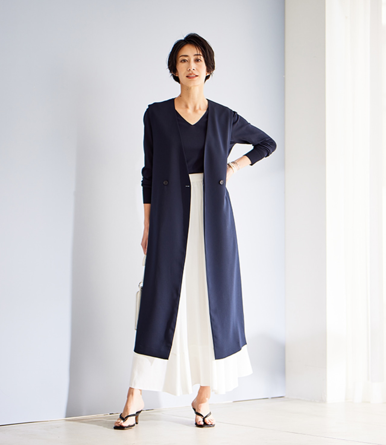 トレンドのロングジレ合わせでマニッシュに。