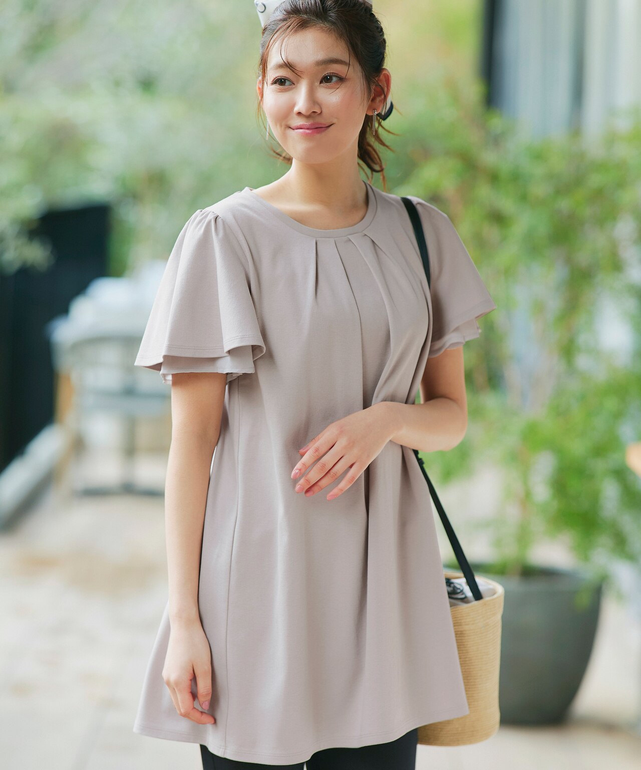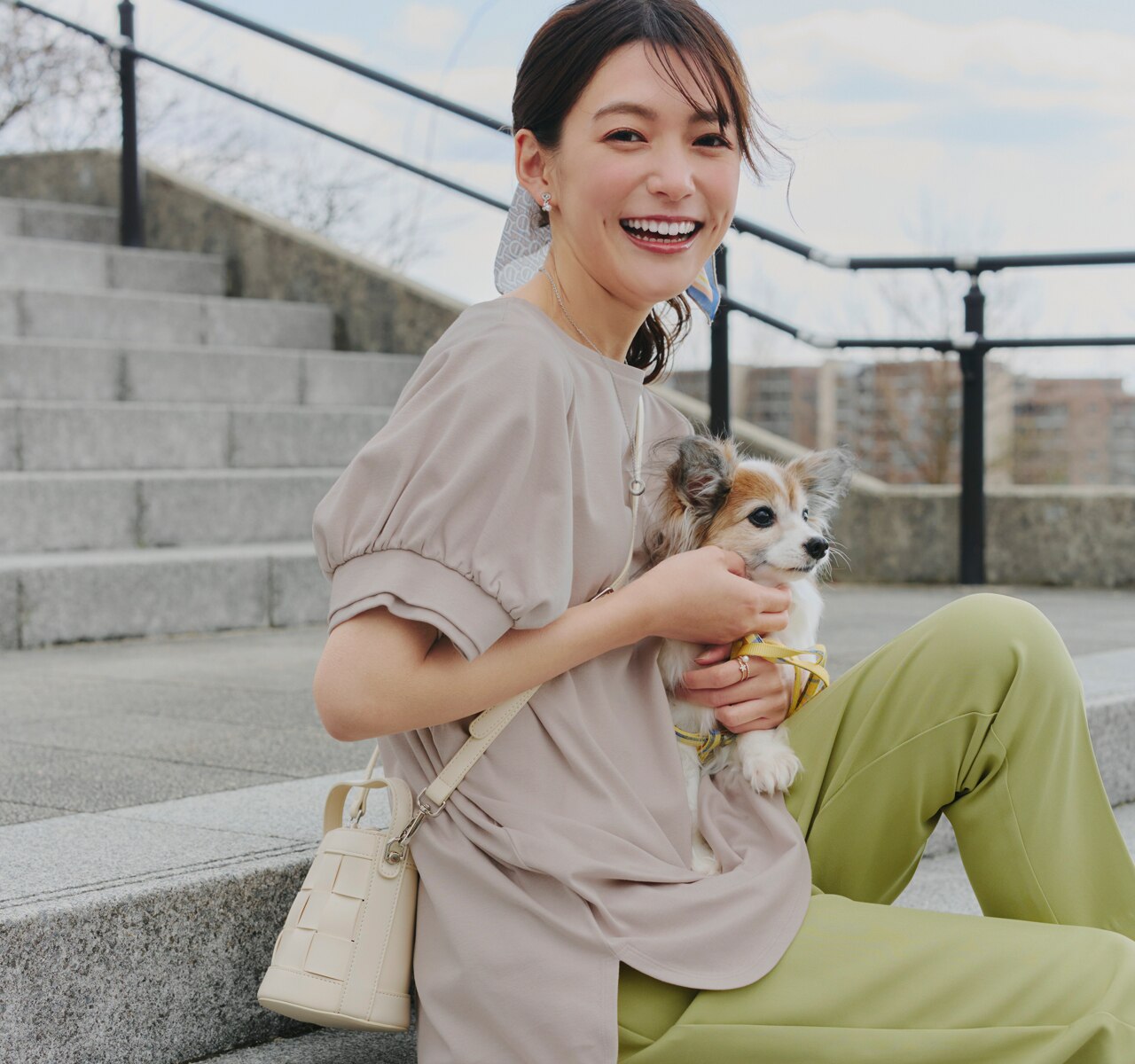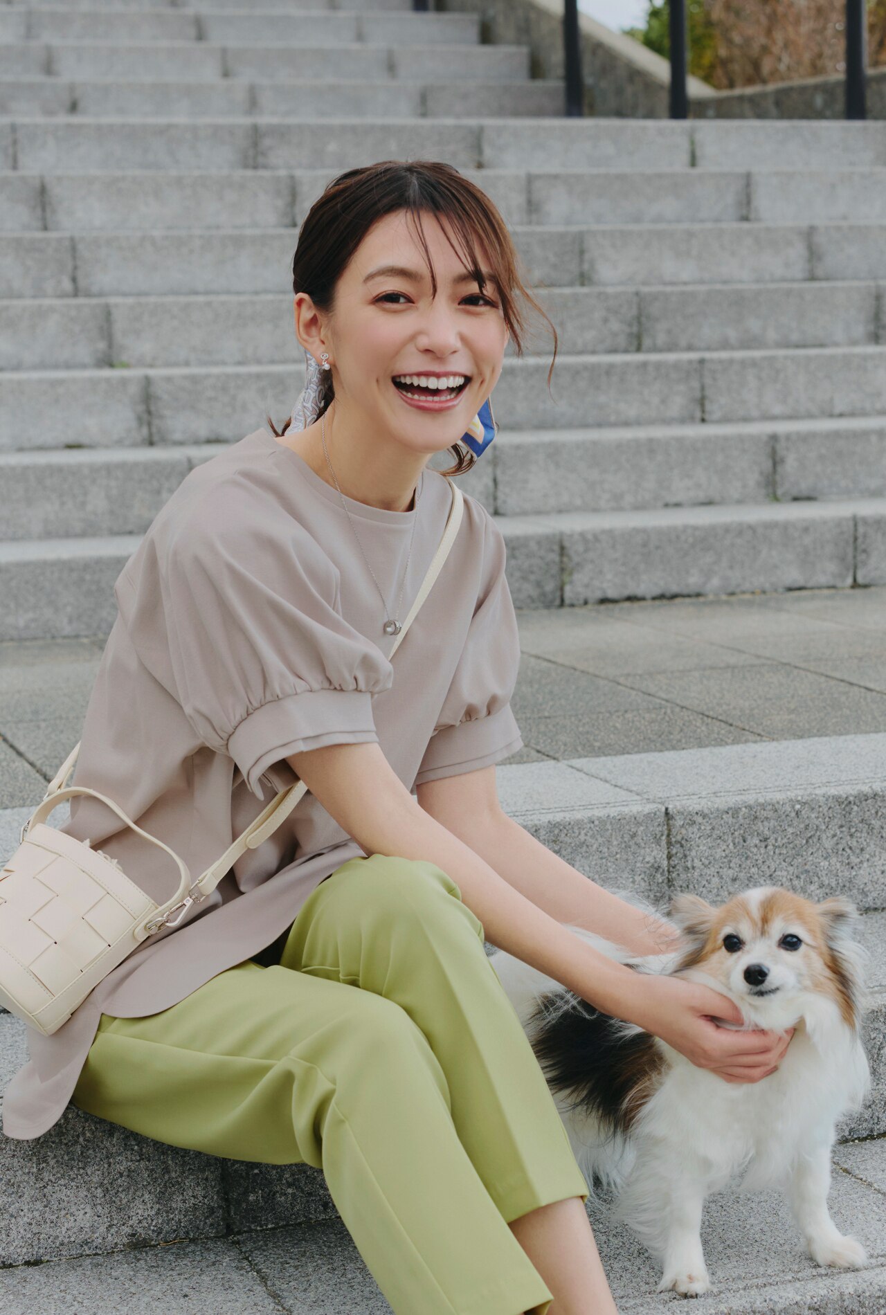 私のワンちゃんはお散歩大好き。なのに階段でストップしちゃった。一緒に座って風に当たろうか。パフ袖が可愛いUVケアも出来るこのチュニックで私はご機嫌なの。