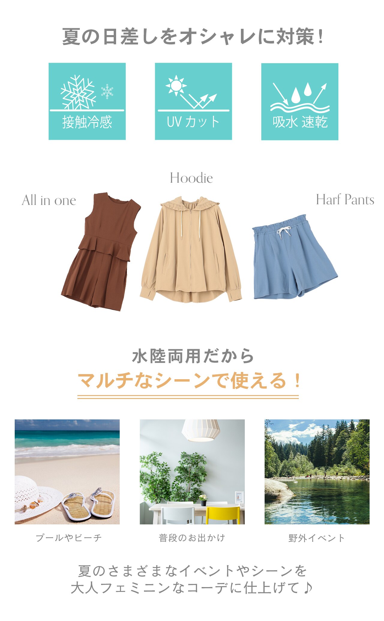 日差し除けに心強いパーカーは大き目のフードで小顔効果◎、体型をカバーしてくれるゆったりなサイズ感。小さめの立体フリルで大人フェミニンなテイストを楽しめます。