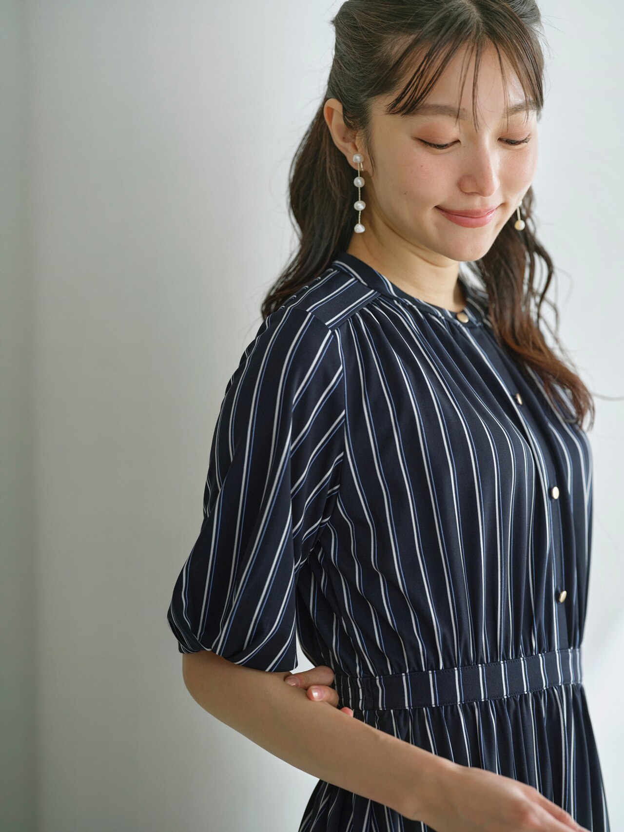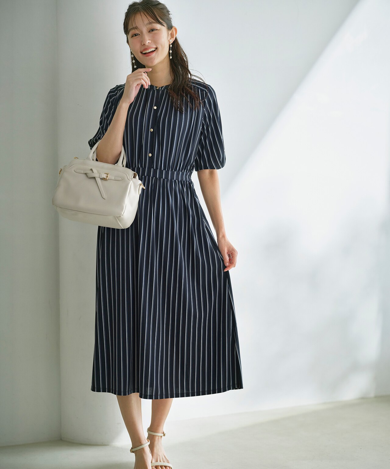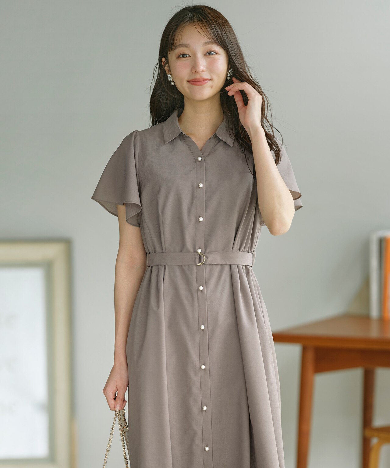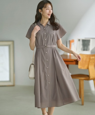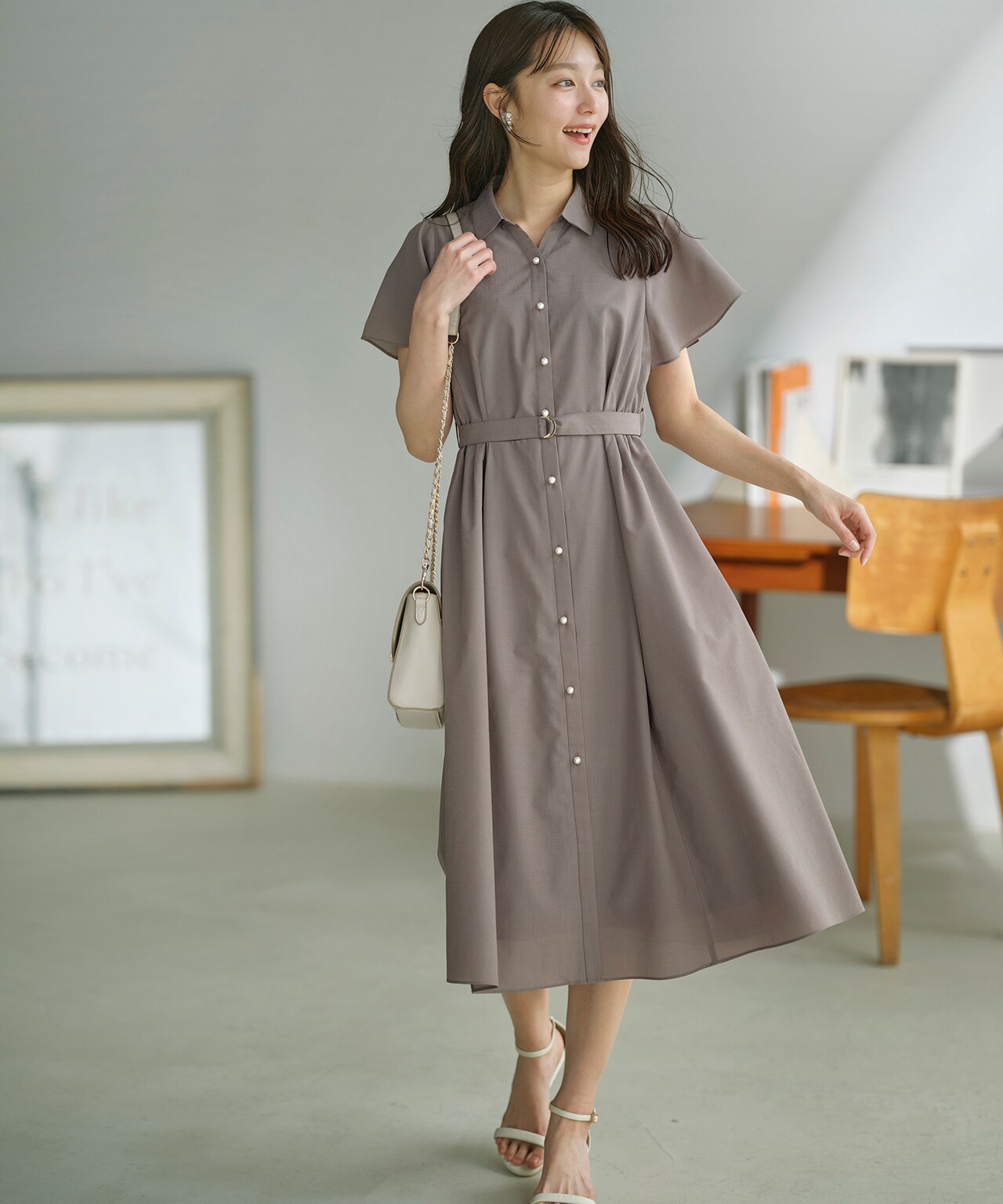 パール調ボタンやフレア袖など、さりげないフェミニンなディテールにこだわったイチオシワンピース。これ一枚できちんと感と上品さを纏えるので、真夏の通勤にも重宝すること間違い無し!昨年大好評だった定番のネイビー、爽やかなライトブルーに加えて、落ち着いた印象の新色モカが登場♪