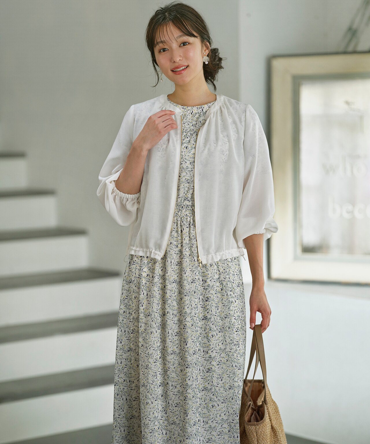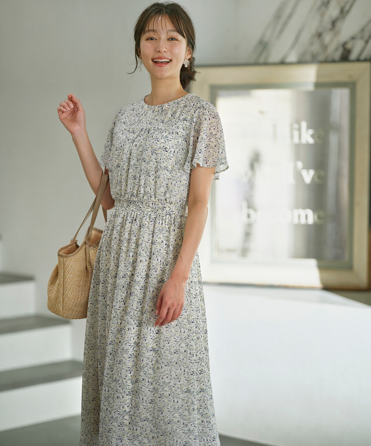 甘さ控えめの小花柄でデイリーから通勤まで幅広く着回せるワンピース。二の腕カバーができるフレア袖や、ウエストのゴムシャーリングでスタイルアップ効果が狙えるのも嬉しいポイント。