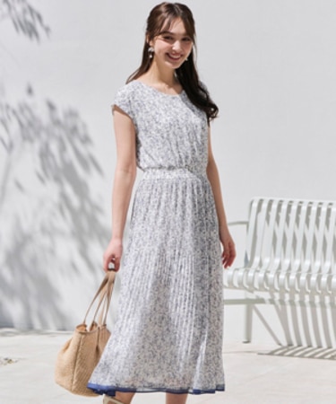 繊細な小花柄と華奢なプリーツ加工が可憐な印象を演出。ストンと落ちるスカートのシルエットが大人っぽく、落ち着いた雰囲気に。裾部分のバイカラーデザインもさりげないデザインポイントになっています。