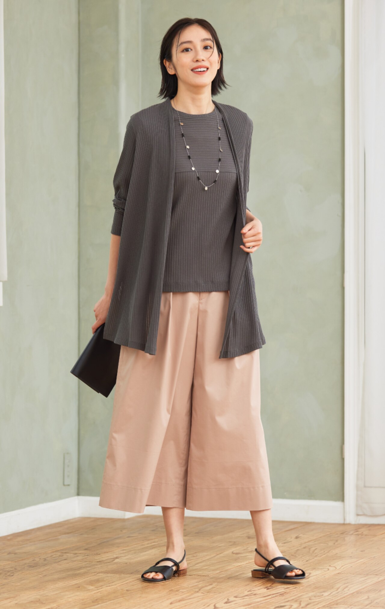 きちんと感もありながら、リラックス感も併せ持つガウチョパンツに、インナーをアウトにしても決まりのよいスレートのロングカーデアンサンブルを合わせた大人のオフコーデ。